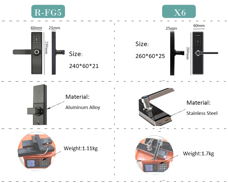 Бренд: RAYKUBE Модель: X6 Название приложения: Tuya / Smartlife Wi-Fi 2,4G Материал: нержавеющая сталь Режим разблокировки: приложение/отпечаток пальца/Пароль/смарт-карта/ключ Датчик отпечатков пальцев: FPC датчик (полупроводниковый датчик) Цвет: черный/серебристый Карта пользователя: 100 Отпечаток пальца пользователя: 100 Тип чипа: двухъядерный драйвер Время чтения: 0,3 секунд Сенсорный экран: IML материал Рабочая мощность: 4 батарейки AAA 1,5 В (не входят в комплект) Рабочая температура: от-25 до 55 градусов Цельсия Функция паролей: Поддержка виртуального паролей Подходит для двери толщиной около 35-65 мм