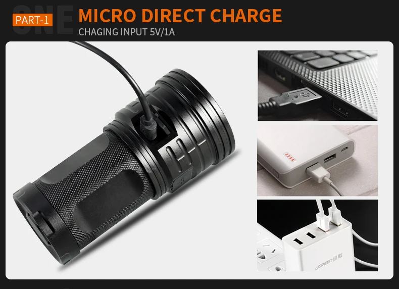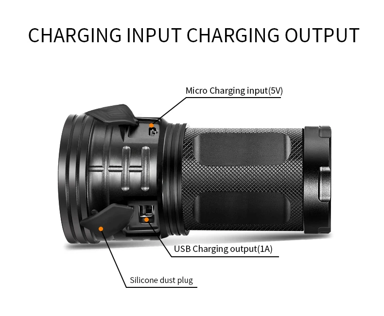 Фонарик может заряжаться с помощью линии Micro USB и заряжать телефон.
