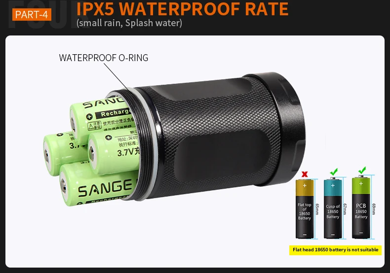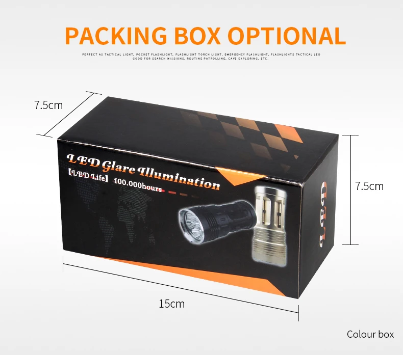 Корпус этого фонарика изготовлен из авиационного алюминиевого сплава, очень прочная конструкция. С жестким анодированным покрытием, анти-абразивный, не царапается и ударопрочный.Специальный дизайн отражателя повышает светильник выход в интенсивности и расстояния.С использованием укрепленных стеклянных линз, алюминиевый светильник и гладкий отражатель. Обеспечивает более концентрированный лучПринятие внутренней проводки применяет высокоэффективный усилитель цепи. Может использовать аккумуляторы в наибольшей степени.Применение 4 шт 3,7 V 18650 Перезаряжаемые батареи для обеспечения стабильного тока и напряжения.Широкое применение, многоцелевой. Идеальный товар для пеших прогулок, кемпинга, охоты и других видов активного отдыха.