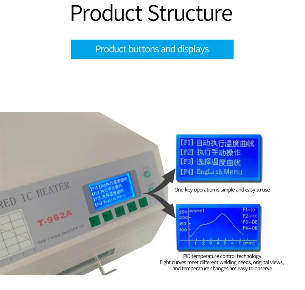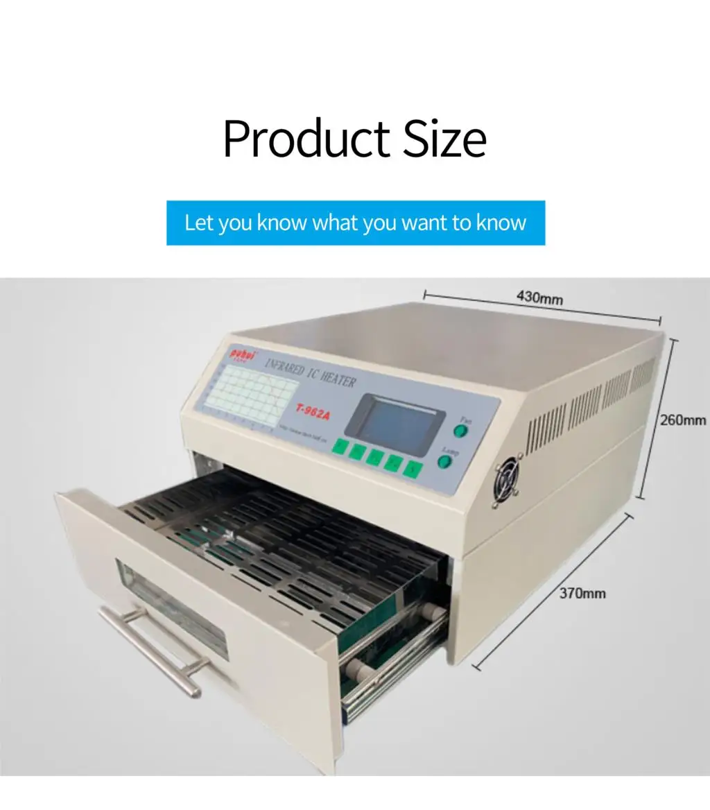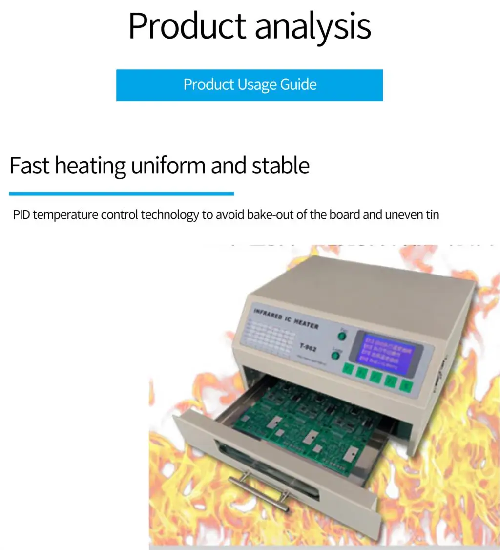 Инфракрасный IC НАГРЕВАТЕЛЬ T962A является микропроцессором, контролируемым оплавлением печи. Он используется для эффективной пайки различных SMD и BGA компонентов. Весь процесс пайки может быть завершен автоматически, и он очень прост в использовании. В этой машине используется Мощное инфракрасное излучение и циркуляция потока горячего воздуха, поэтому температура остается очень точной и равномерно распределена.