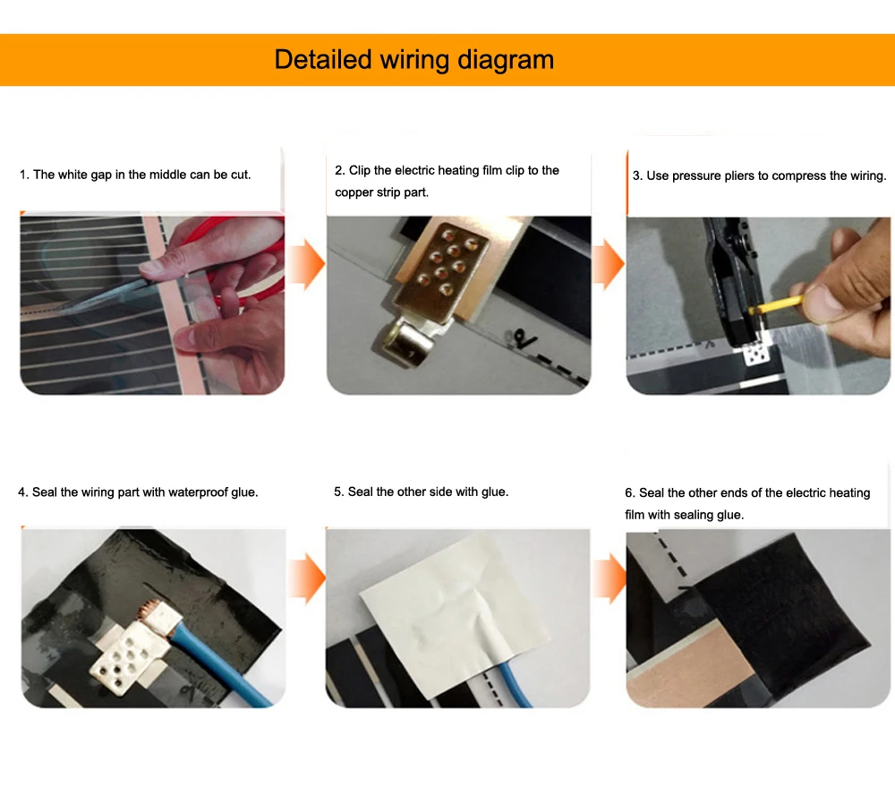 1. Белый зазор в середине можно разрезать.2. Прикрепите электрическую нагревательную пленку к части медной ленты.3. Используйте плоскогубцы для сжатия проводки.4. Уплотните часть проводки с помощью водонепроницаемого клея.5. Уплотните другую сторону цементом.6. Запечатайте другие концы электрической нагревательной пленки герметичным клеем.