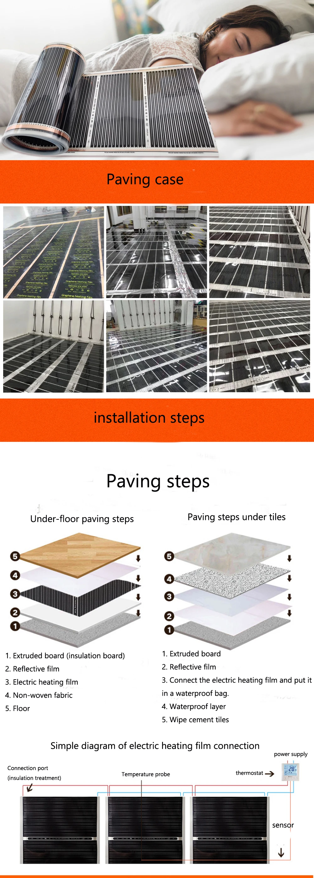 1. Этапы укладки пола: экструдированная доска reflective Отражающая пленка ➔ электрическая нагревательная пленка ➔ Нетканая ткань Floor пол.2. Этапы тротуарной плитки: экструдированная доска reflective Отражающая пленка connected соединена с электрической нагревательной пленкой и помещена в водонепроницаемый герметичный мешок ➔ водонепроницаемый слой ➔ протирать цемент и плитку.