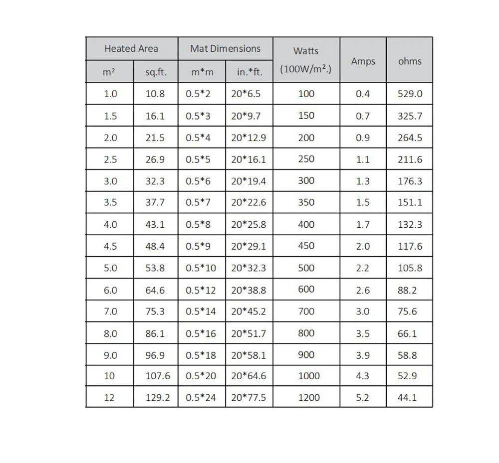 1. Теплый коврик был использован под многими популярными напольными материалами, такими как керамическая плитка, натуральные камни, дерево и так далее. Один кусок 35 кв. футов. Коврик состоит из нагревательного кабеля, защищенного двусторонней лентой на стекловолоконную сетку.2.UL для США и Канады. Фторполимер (один из самых тяжелых пластиковых материалов) в качестве изоляции. Используется для влажного применения, но не для установки в бассейнах и спа-салонах, а также для использования на открытом воздухе. 30 лет ограниченной гарантии на нагревательную сетку. Ограниченная гарантия действительна на основе правильных методов установки и выполнения всех требований к испытаниям.3. Размер коврика: 50 "в ширину, Длина может быть выбран; Напряжение: 240V, ампер: 3,5 A, Ватты: 150W/м². Выход: 12 Вт/кв. М. Синий нагревательный элемент нельзя разрезать. Сетчатый материал можно разрезать, чтобы сделать поворот и углы для нагрева практически любой области формы. Более детальный процесс установки приведен в инструкции.Сверхтонкий и прочный нагревательный элемент (всего 1/8 "толстый), предварительно разделенный провод, прикрепленный к жесткой сетчатой подложке из стекловолокна, кабель не может быть отрезан, но Матирование может быть, чтобы вы могли повернуть угол или обратное направление.4. Полностью самоклеящаяся Подложка для удобства укладки вместе с полными и комплексными инструкциями по установке для вашего удобства. Используется в сочетании с контроллером термостата. Легко установить в вашу душевая комната, кухонную комнату, влажную комнату, гостиную, теплицу и так далее. Рекомендуется сотрудничать с термостатом для работы.