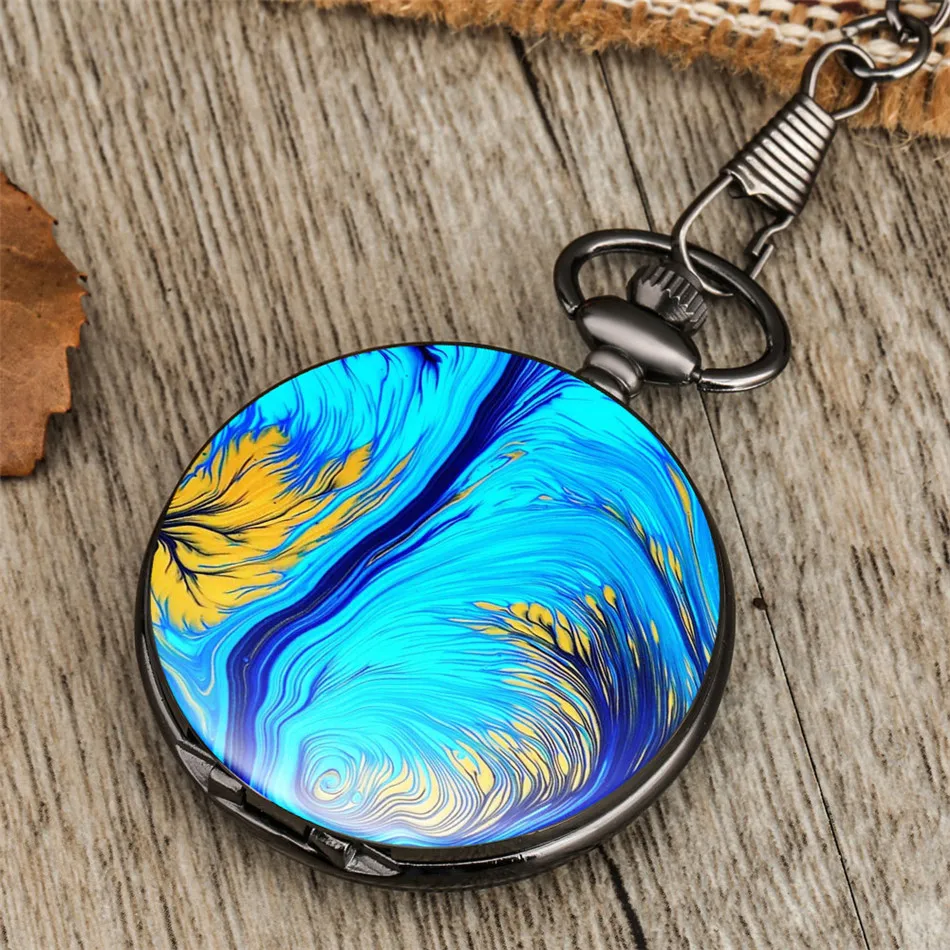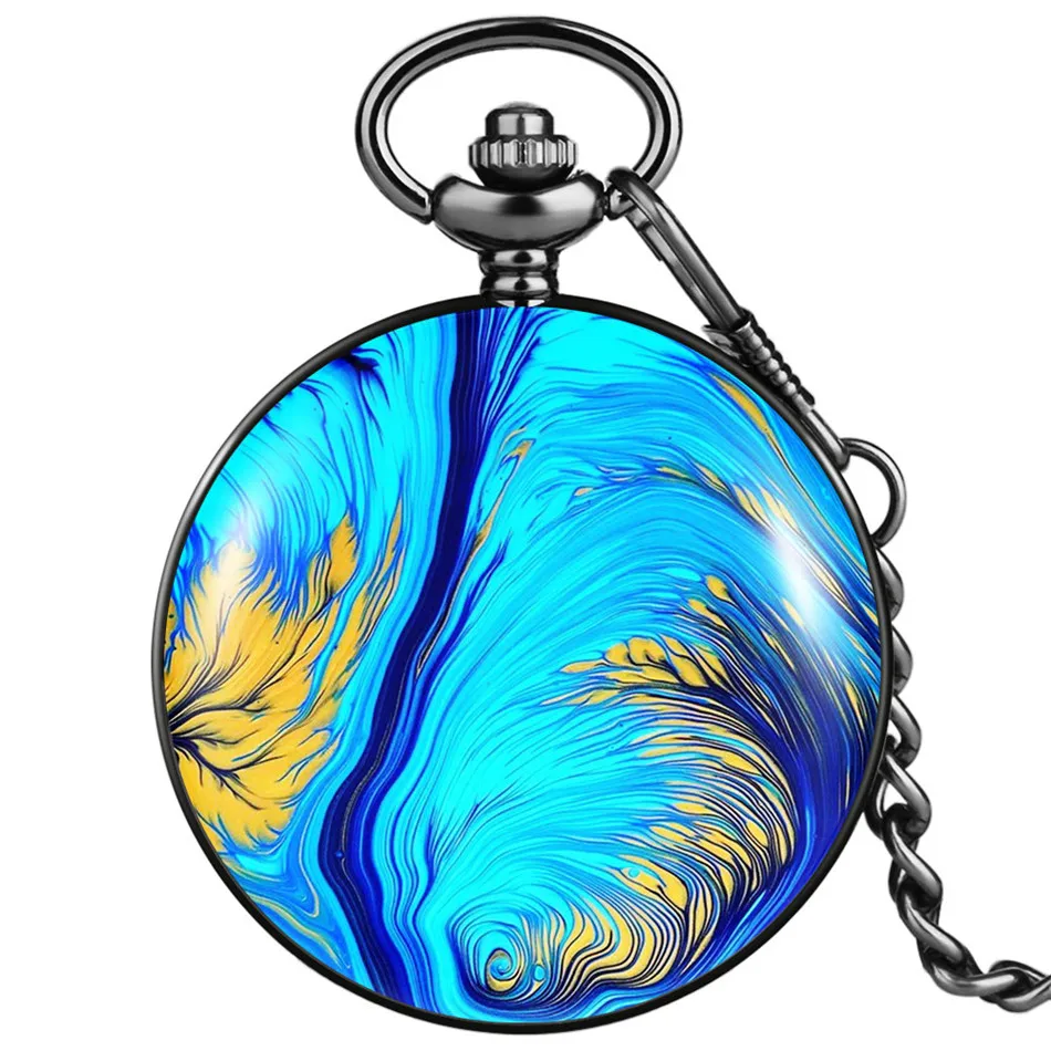 Карманные часы Ocean Blue с акварельным принтом, кварцевые часы с ретро-подвеской и черным карманом на цепочке 30 см, антикварные часы