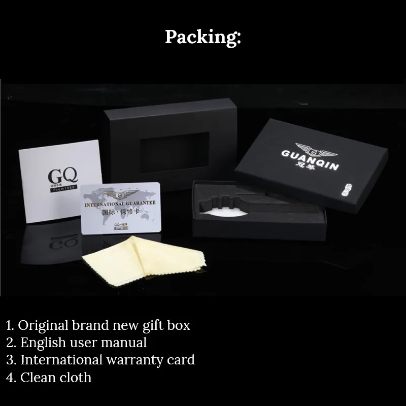 • Упаковка: оригинальная Фирменная новая Подарочная коробка GUANQIN, руководство пользователя, Международная гарантийная карта,Чистая ткань