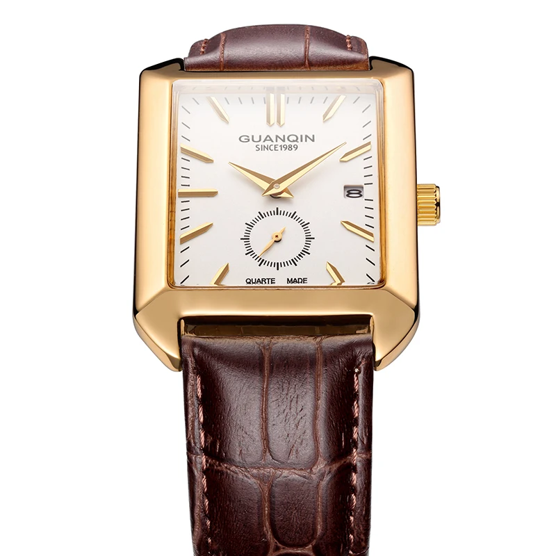 Высококачественные мужские часы GUANQIN 2018, Модные прямоугольные кварцевые часы с календарем, маленький секундный циферблат, кожаный ремешок, мужские часы
