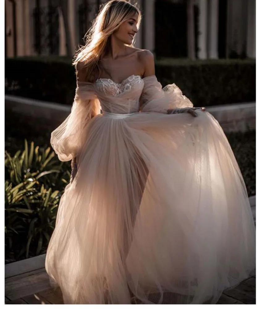 Свадебное платье принцессы с аппликацией сердечки платье невесты с пышными рукавами ТРАПЕЦИЕВИДНОЕ фатиновое платье с открытой спиной