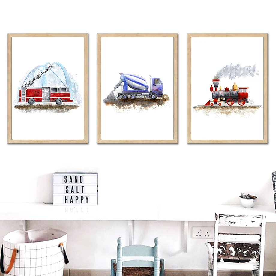 Мультфильм огонь грузовик, инженерный транспорт Детская Wall Art Хо...