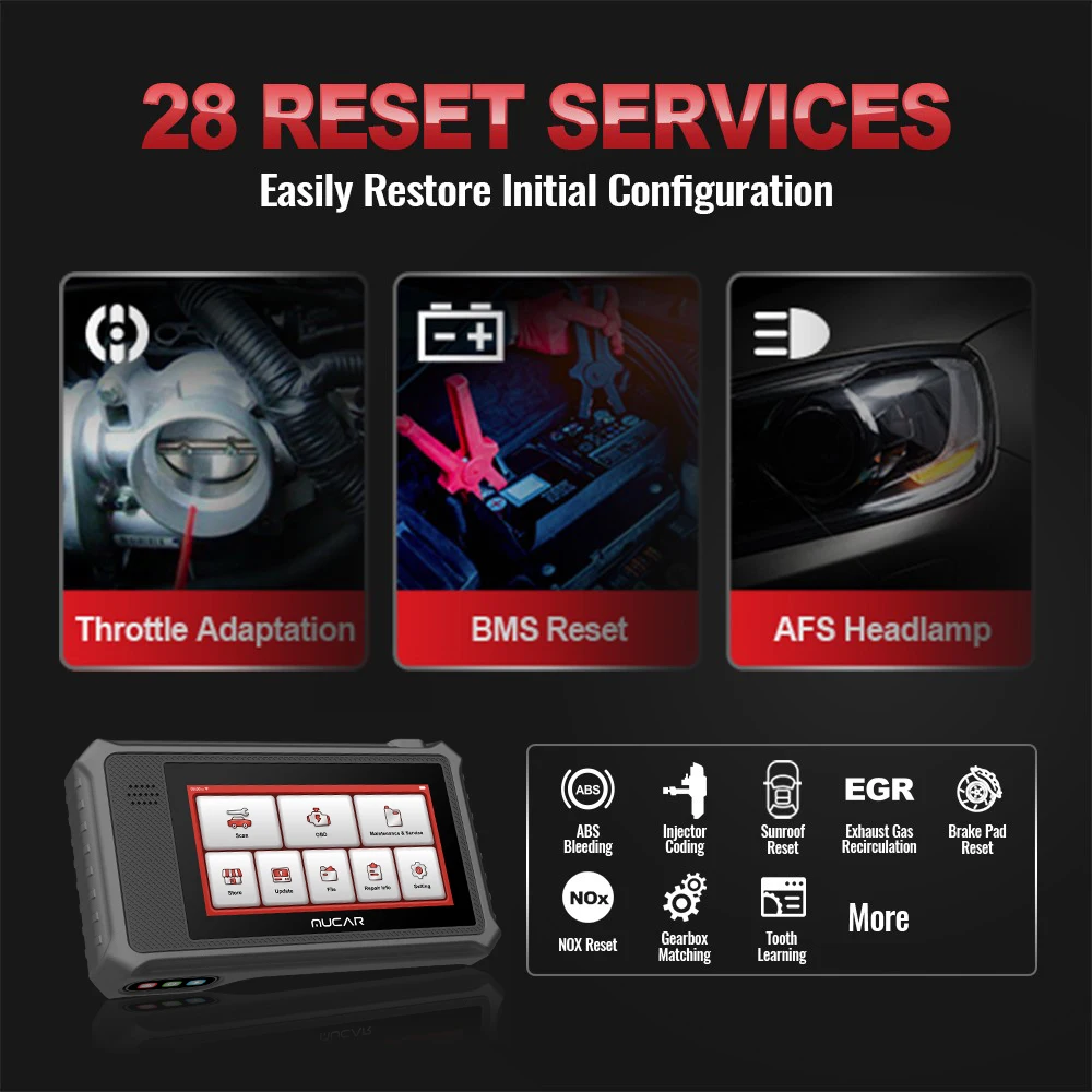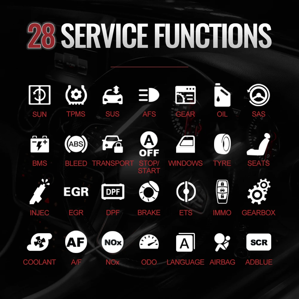1. Услуга сброса масляной лампыПозволяет выполнить сброс для нового расчета системы жизненного цикла моторного масла после смены масла.2. Электронный сброс стояночного тормоза EPBЭто важно для поддержания безопасности и эффективности электронной тормозной системы.3. Батарея BATПозволяет сканеру оценить состояние заряда аккумулятора, отслеживать ток замыкания, зарегистрировать замену аккумулятора и активировать остальное состояние транспортного средства.4. Сброс дизельного сажевого фильтра DPFСпециально работает с дизельной фильтрующей системой твердых частиц с регенерацией DPF, преподавателем замены компонентов DPF и преподавателем DPF после замены блока управления двигателем.5. Сброс датчика рулевого колеса SASПомогает очистить воспоминания о датчике угла поворота руля и играет важную роль в калибровке датчика угла поворота руля.6. Система контроля давления в шинах TPMSИмеет смысл отображать идентификаторы датчиков из Эбу транспортного средства, вставлять идентификаторы замены датчиков TPMS и датчики тестирования.7. Программирование ключей IMMOУникальная функция программирования автомобильных ключей и считывания ПИН-кода, она в основном используется для отключения потерянных ключей автомобиля и программирования нового брелока для замены.8.ABS кровоточивостьТормозная система ABS обеспечивает прочную тормозную колодку После истощения воздуха после ремонта насосной системы ABS.9. Сброс люкаЛюк на крыше должен быть сброшен, когда блок управления Люком на крыше имеет проблемы с СВЯЗЬЮ или изменен.10. Сброс подвескиПопробуйте перезагрузить электронную подвеску air ride с помощью массажной системы закройте все двери koeo flip through message system перейдите в сброс подвески или выключите.11. Сброс коробки передач (коробки передач)Процедура сброса передачи Адаптивное обучение DIY. Завести машину и поехать. После выполнения этой процедуры блок управления двигателем (ECU) и блок управления коробкой передач (TCU) будут работать вместе, чтобы узнать, как Вы управляете, отслеживая свой режим вождения. После того, как вы будете следовать этому методу программирования автомобиля TCU / ECU.12. Сброс фары AFS«Afs' означает адаптивную систему переднего освещения (ночью с биксеноновыми фарами) она вращается с любой стороны, нажатие на эту кнопку означает, что они остаются направленными прямо вперед и не поворачиваются при повороте руля.13. Кодирование инжектораУтечка инжекторов и некоторые мертвые инжекторы могут быть пропущены, даже когда инжектор отключен. Другие проблемы с системой зажигания и механическими компонентами также могут не столкнуться с потерями оборотов при выключении инжектора.14. Адаптация дроссельной заслонкиКорпус дроссельной заслонки представляет собой трубку, содержащую поворотный плоский клапан (бабочка), который используется для контроля количества воздуха, поступающего в двигатель. В автомобиле с электронным впрыскиванием топлива с компьютером взаимодействует Датчик положения дроссельной заслонки и датчик воздушного потока, который поставляет соответствующее количество топлива, необходимое инжекторам. Необходимо повторно изучить положение датчика дроссельной заслонки после очистки или ремонта.15. Обучение снаряжениюИнструмент сканирования отслеживает некоторые датчики положения распредвала сигнализируют, чтобы определить, 