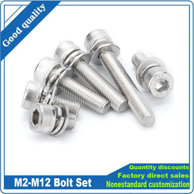304 Нержавеющаясталь шестигранные винты с шестигранной Кепки сем головы винт с плоская шайба пружинная прокладка комплект болтов M2 M2.5 M3 M4 M5 M6 M8 M10 M12