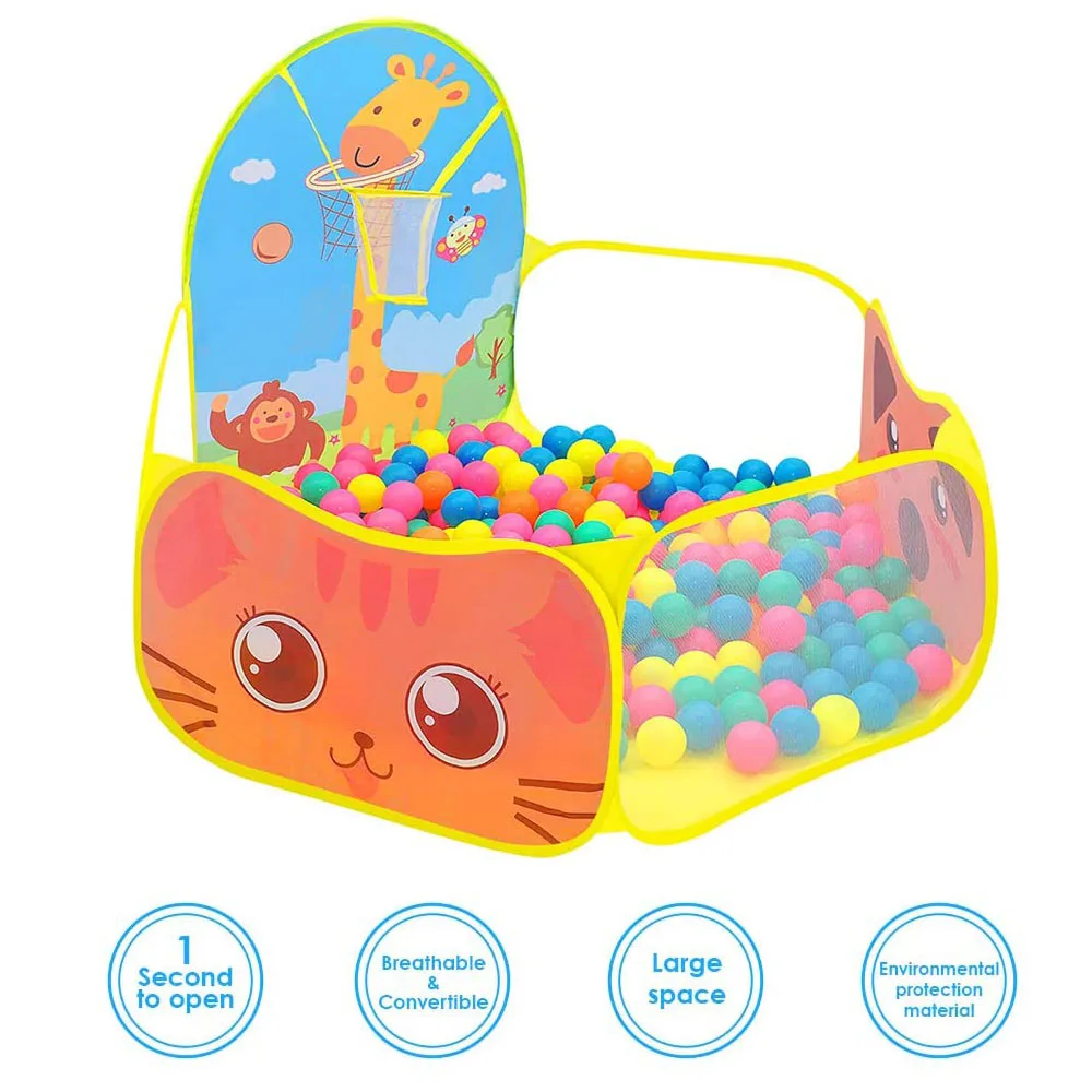 Характеристики: Детская палатка с мультипликационным принтом для маленьких детей; Большой объем для хранения в помещении и на открытом воздухе; Может вмещать много шариковых косточек и быть достаточно большим для детей, чтобы играть в мяч с Баскетбольным кольцом, ребенок может снимать с мячом в корзине, изготовленной из экологически чистого и сверхпрочного материала, безопасного, Дышащий и прочный идеально подходит для использования в помещении, например, в гостиной, детской комнате, в дневное время и т. д., быстро собирается за считанные секунды, Легко протирается сухой тряпкой Спецификация: Название изделия: детская игровая палатка Возраст: 6 месяцев-5 лет Материал: полиэстер + сталь размер изделия: 120x102x74 см Цвет: синий, розовый, желтый (по желанию) упаковка включает 1 детскую палатку (без шариков)