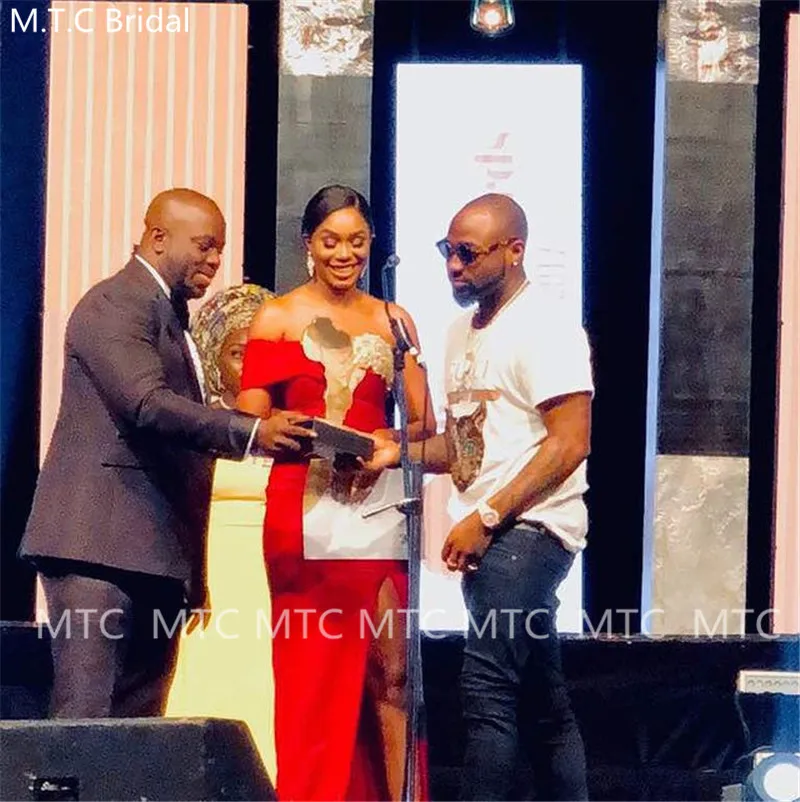 Красные длинные платья-русалки с высоким разрезом для выпускного вечера с золотым кружевом и открытыми плечами, южноафриканские вечерние платья макси для выпускного вечера