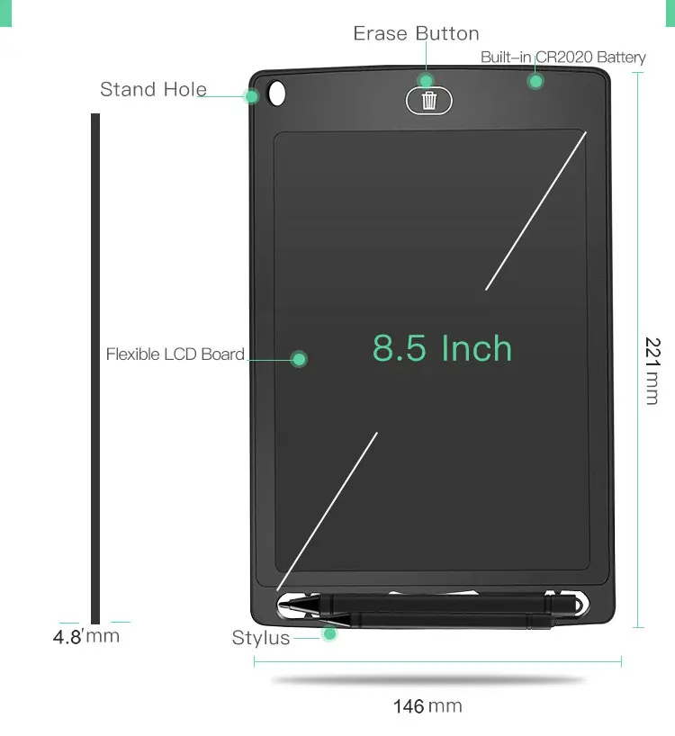 Чувствительная к давлению поверхность ЖК-дисплея делает ваше письмо или рисунок появляются без каких-либо задержек.Пишите или рисуйте с помощью прилагаемого пластикового стилуса или любого другого подходящего инструмента, даже пальцем!Простота в эксплуатации и высокая эффективность, Стирайте рисунок одним нажатием кнопки стирания.Ультратонкий и компактный дизайн, легко носить с собой и легко скользить в ваш портфель, рюкзак или другую сумку.Легкий и портативный, идеально подходит для школы, офиса, домашнего использования или другого использования.Встроенный сменный кнопочный элемент.