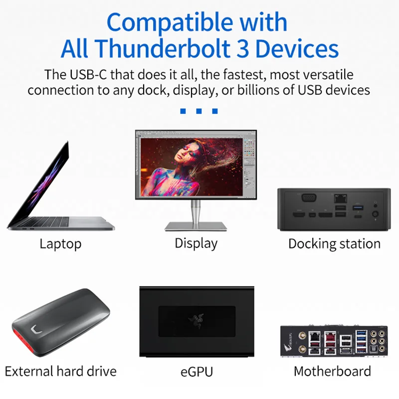 Дорогие друзья! Следуйте за нами и получайте эксклюзивные купоны! 【 40 Гбит/с и 100 Вт 】 кабель Thunderbolt 3 поддерживает передачу данных до 40 Гбит/с и зарядку до 100 Вт, на 8х быстрее, чем стандартные USB-C кабели. Все полностью USB-C совместимы. 【 5K @ 60Hz Video】Daisy chain до 6 устройств Thunderbolt, включая док-станции, жесткие диски, внешние графические карты и дисплеи. Наслаждайтесь разрешением видео ultra HD, пропускная способность 40 Гбит/с позволяет двойной 4K @ 60 Гц видео или один 5K @ 60 Гц выходы 40 Гбит/с скорость кабели подходят для eGPU и двойной 4K отображения сценариев. 【Широкая Совместимость 】 этот кабель совместим с режимом Alt Thunderbolt 3, USB 3,1, Gen 1,Gen 2 и DisplayPort. Совместимость с Mac с поддержкой Thunderbolt 3 (поздний 2016 MacBook Pros и более новые модели, MacBook Air 2018 и iMac Late 2017, 2018) и Thunderbolt 3 Windows, такие как Dell XPS, HP Spectre, И Lenovo Carbon X1 series и другие USB-C док-станции Thunderbolt 3, накопители и периферийные устройства.