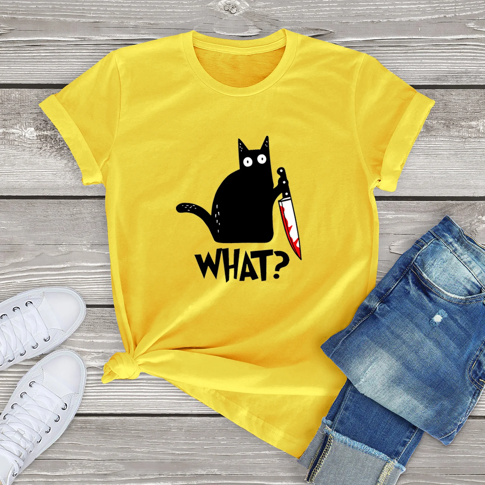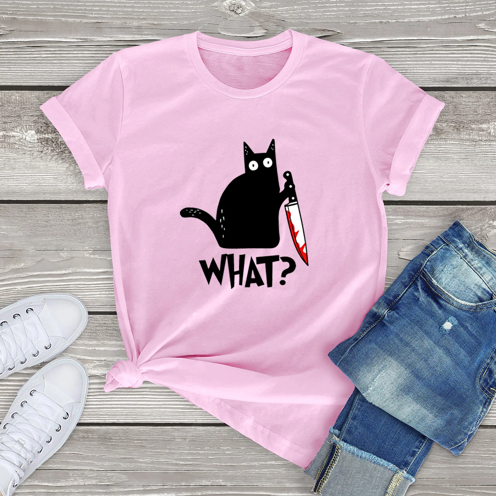 Чёрная кошка что? Забавная женская футболка с ножом в виде убийственного кота, подарок на Хэллоуин, футболка унисекс, хлопковые футболки, забавный подарок