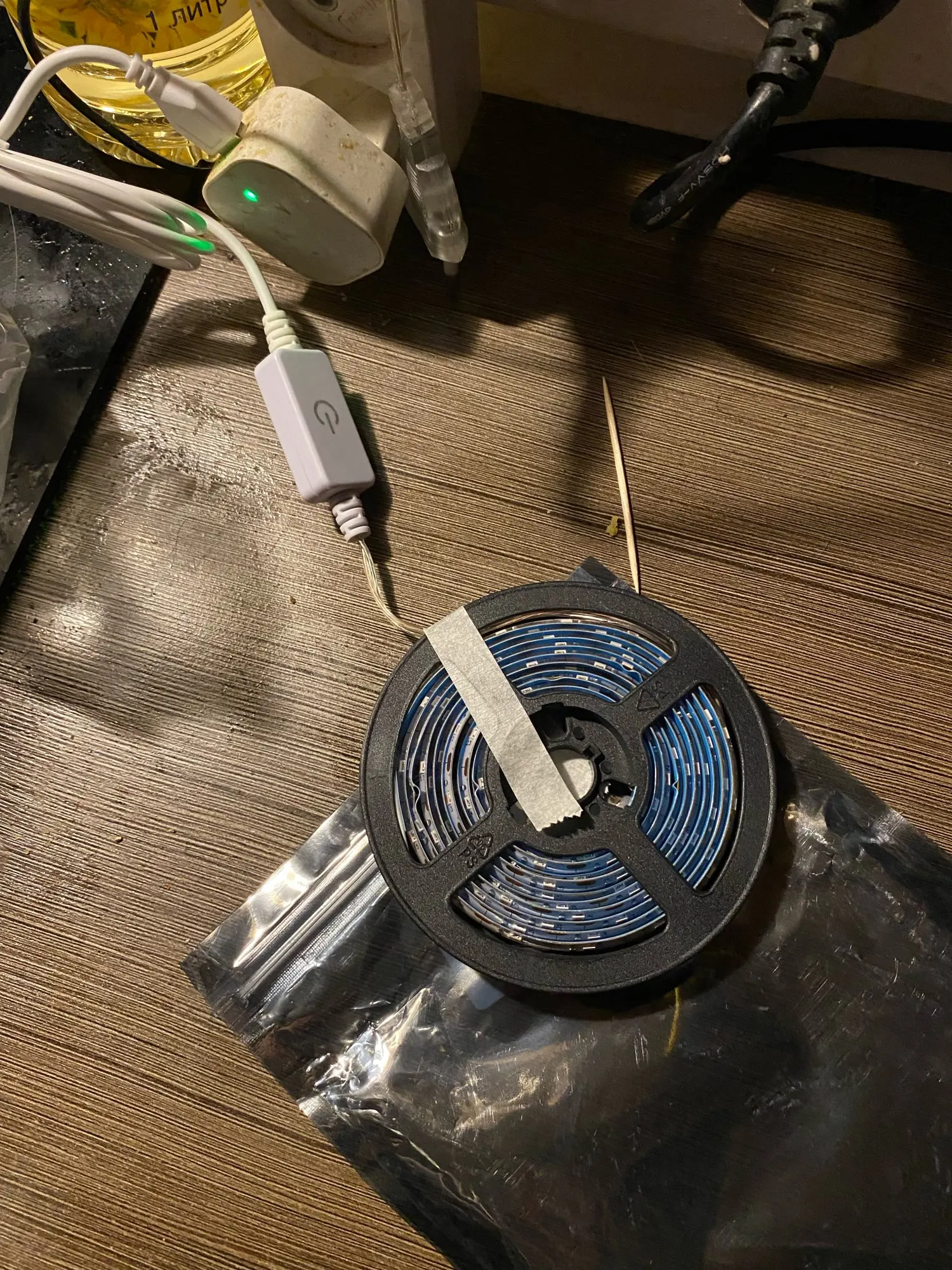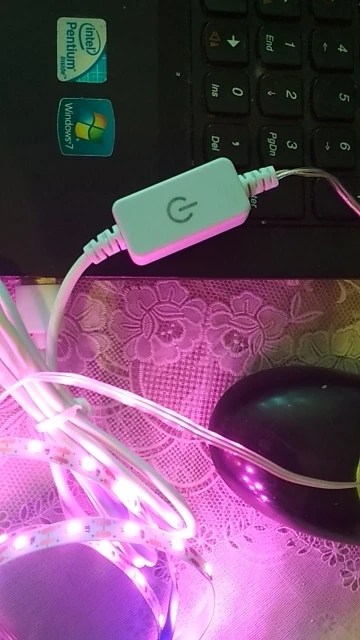клейкая сторона не клейкая от слова вообще. (( вся липучка осталась на подложке. повесила на свою 3М... светит больше голубым, но так даже лучше. кнопка работает исправно, провод длинный.