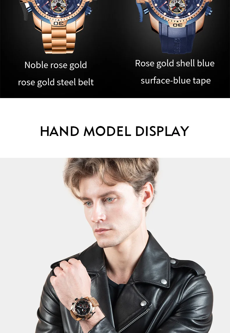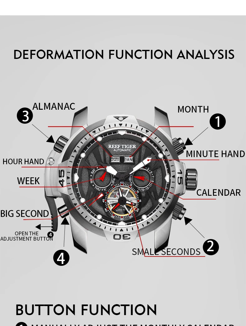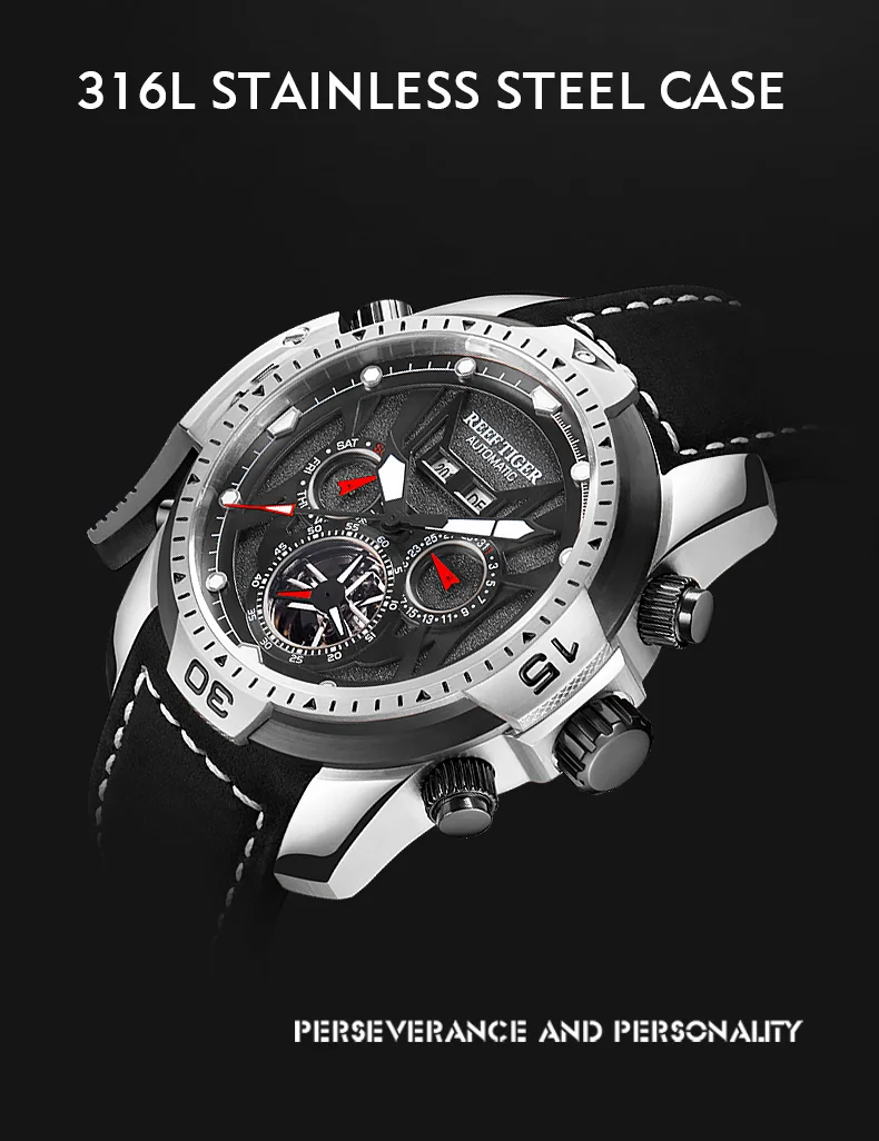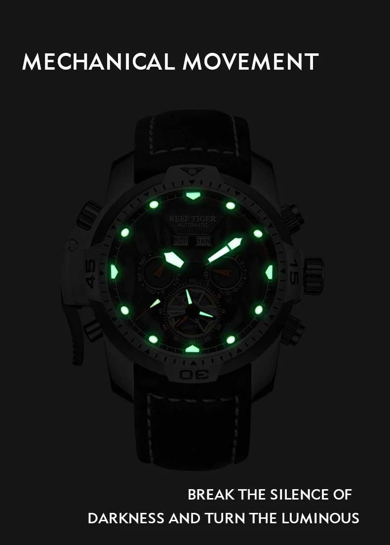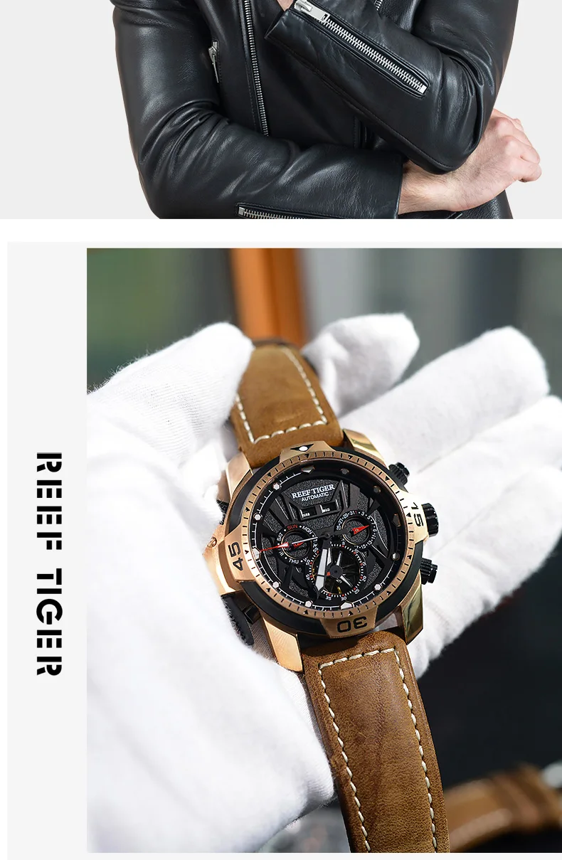 Мужские спортивные часы Reef TigerRT, сложный циферблат с вечным календарем на год, розовое золото, черный циферблат, часы с браслетом