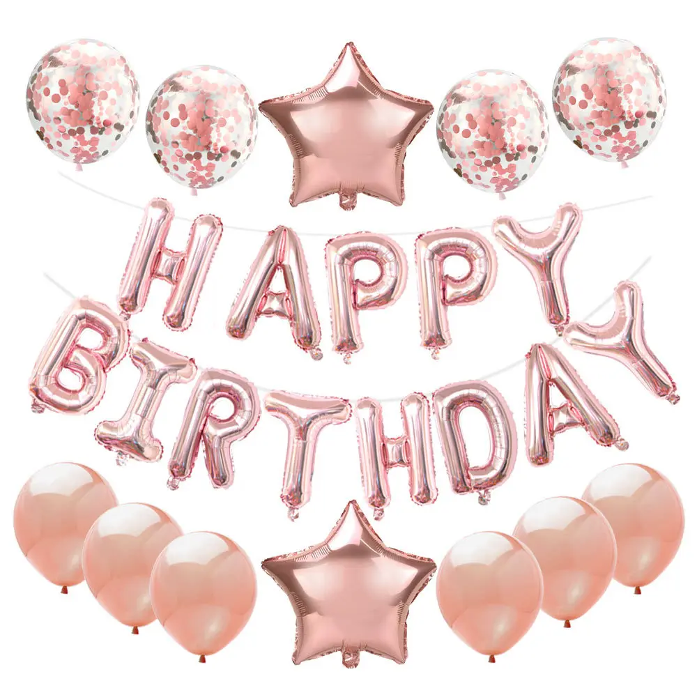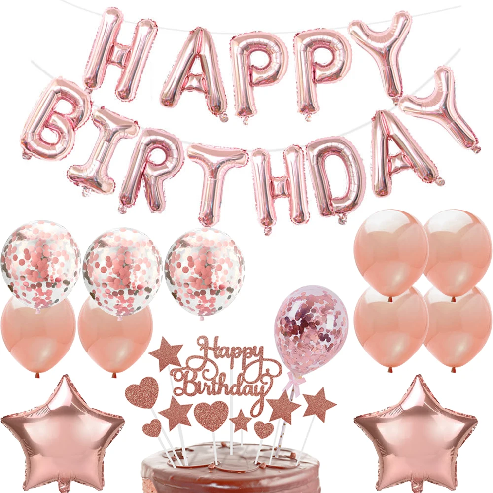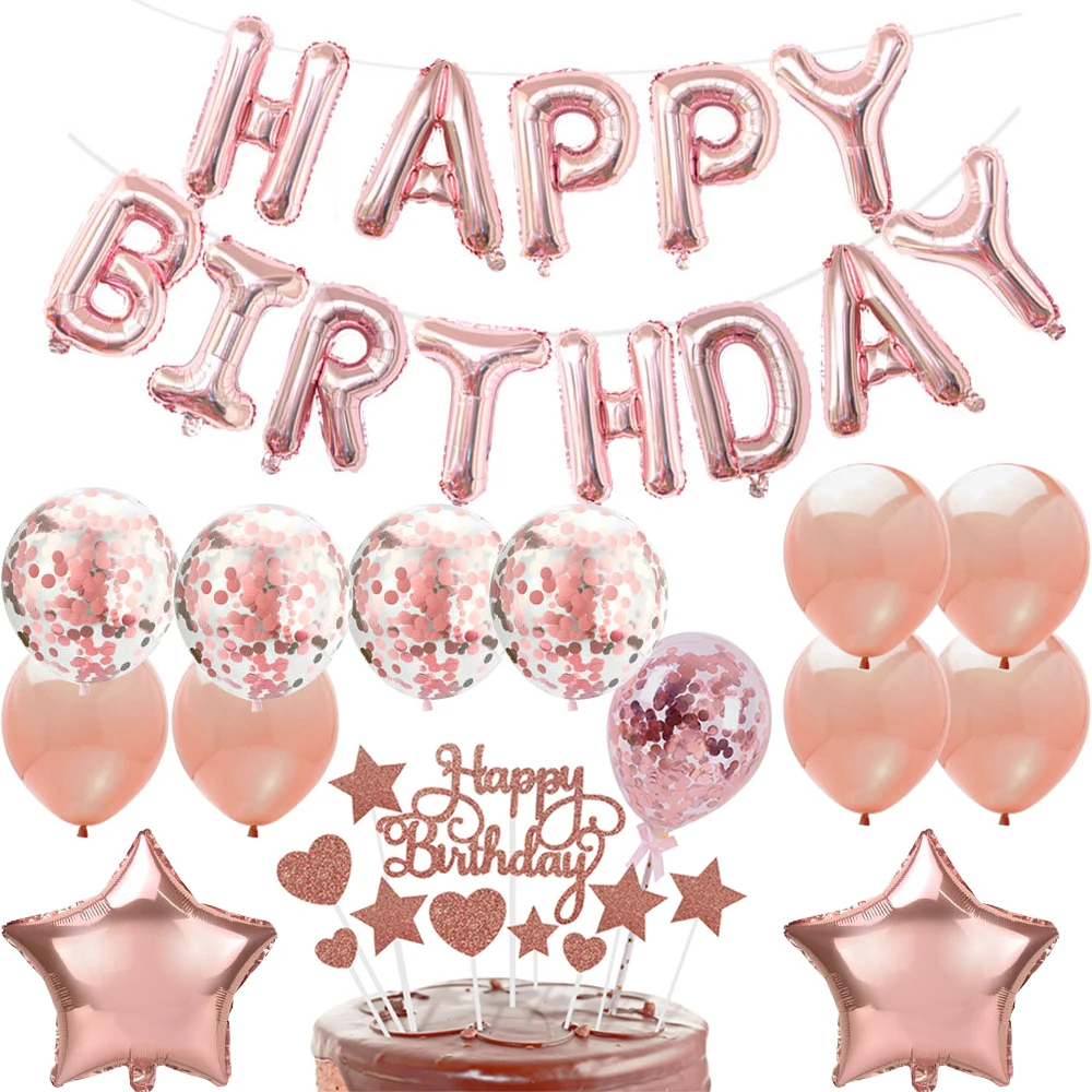 Розовое золото, воздушные шары на день рождения, торт, Топпер, баннер, украшение на день рождения для мальчиков и девочек, детский душ, украшение для вечеринки, поставкаНабор шаров: 6 латексных шаров 12 дюймов + 4 воздушных шара с конфетти 12 дюймов + 2 воздушных шара 18 дюймов с пятью звездами + 1 набор 16-дюймовых баннеров на день рождения
