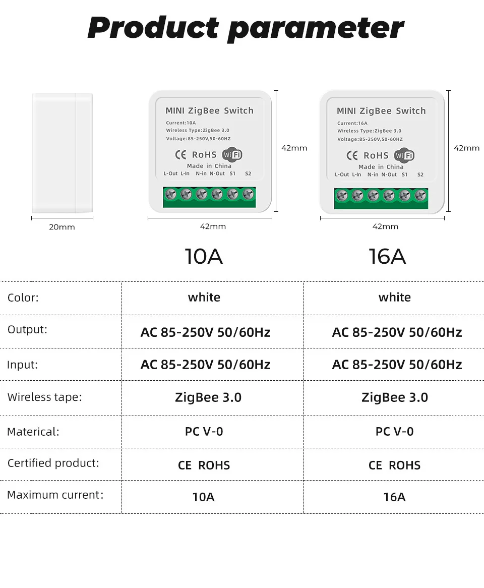 Tuya ZigBee 3,0Вход Напряжение: 100-240V 50/60HzМакс. Ток нагрузки: 16AWi-Fi, Стандартный: 2,4 ГГц 802,11 b/g/nНазвание приложения: Tuya Smart/Smart LifeРазмер: 42*42*20 мм