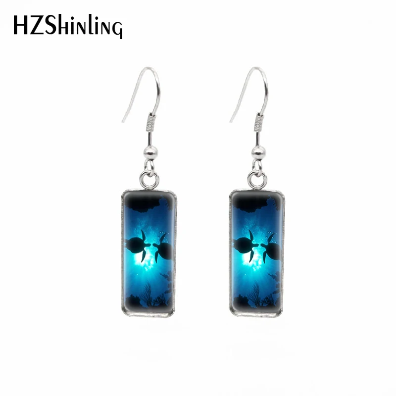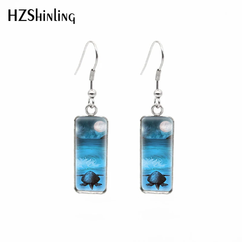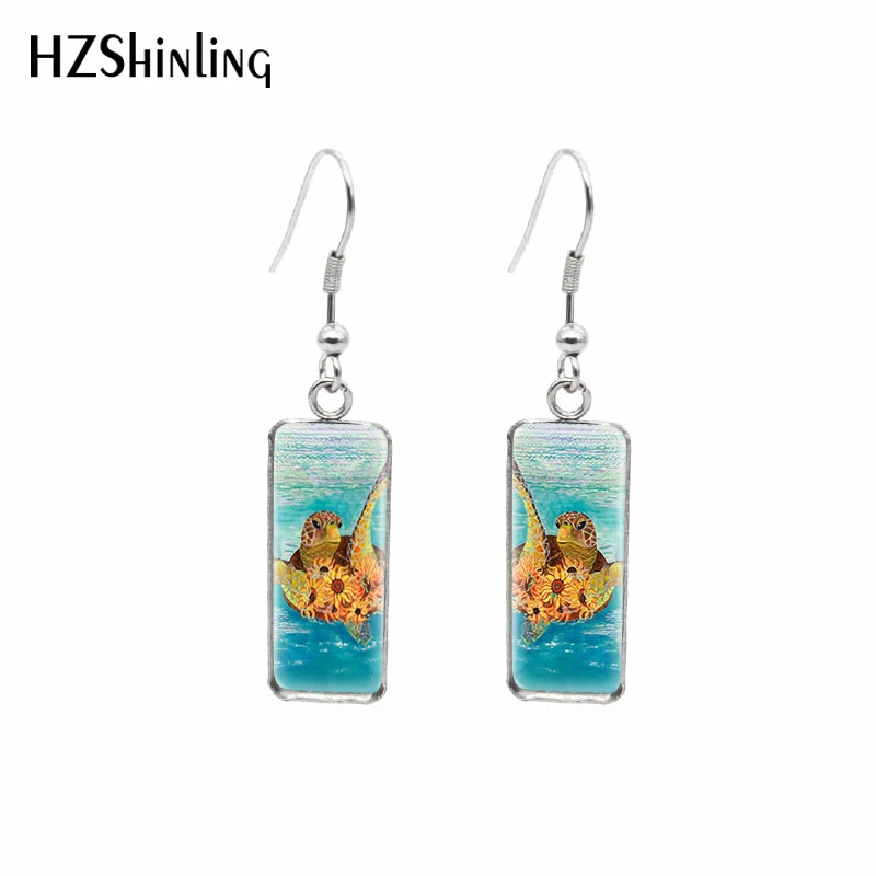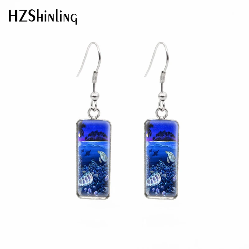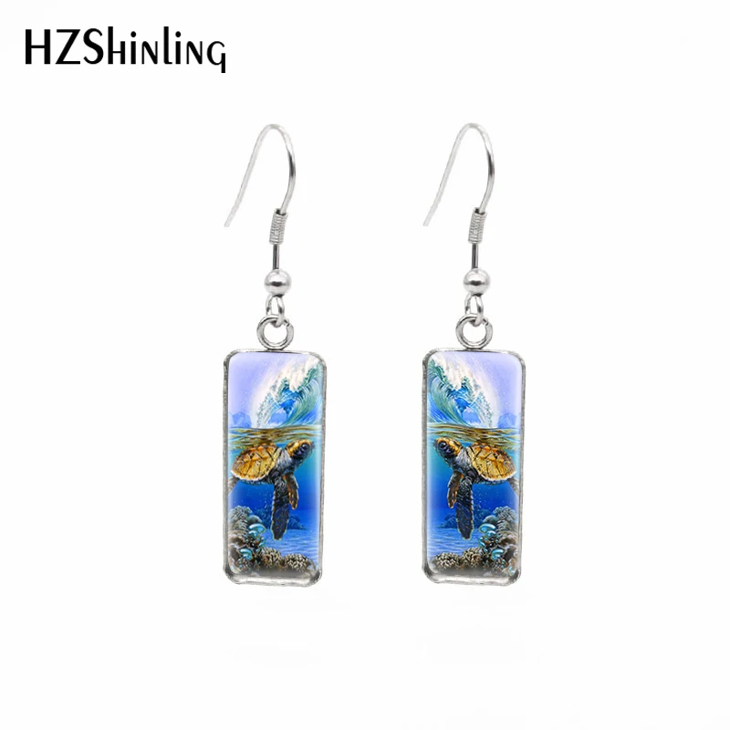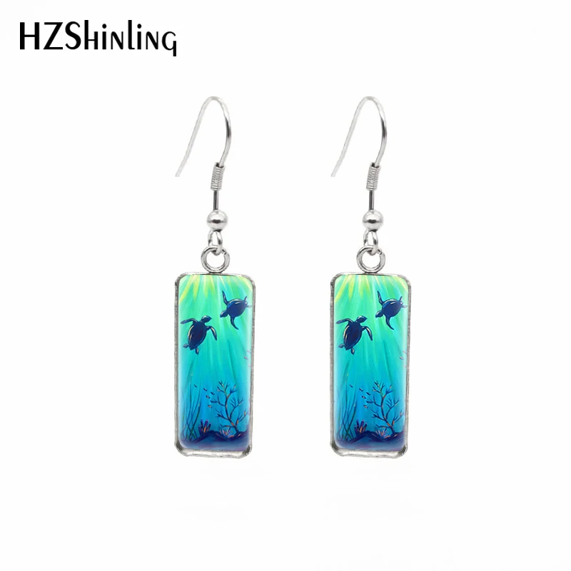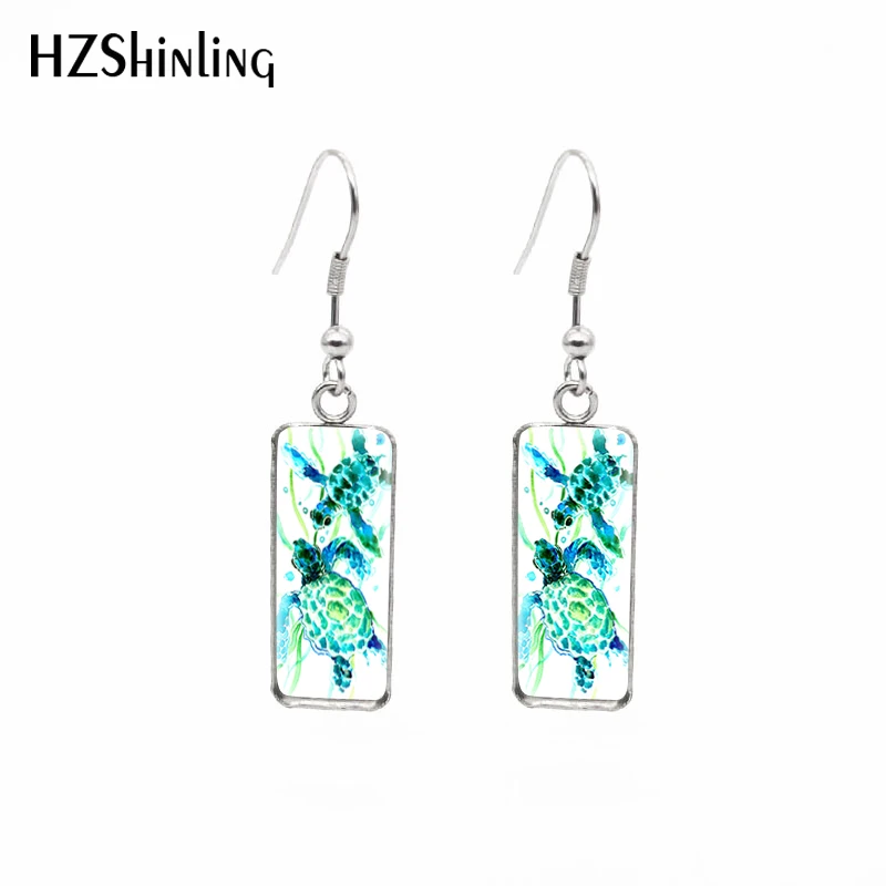2021 новые прямоугольные серьги в виде морских черепах под водой, художественная роспись, серьги с крючком, стеклянный кабошон, ювелирные изделия ручной работы