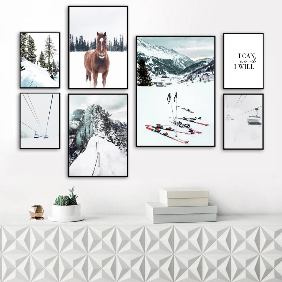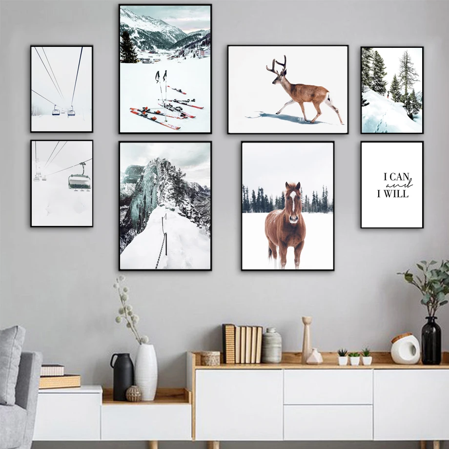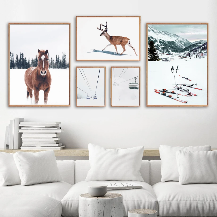 Лошадь олень снег гора лес Лыжная доска настенная Картина на холсте скандинавские постеры и принты декор комнаты Настенные картины для гостиной