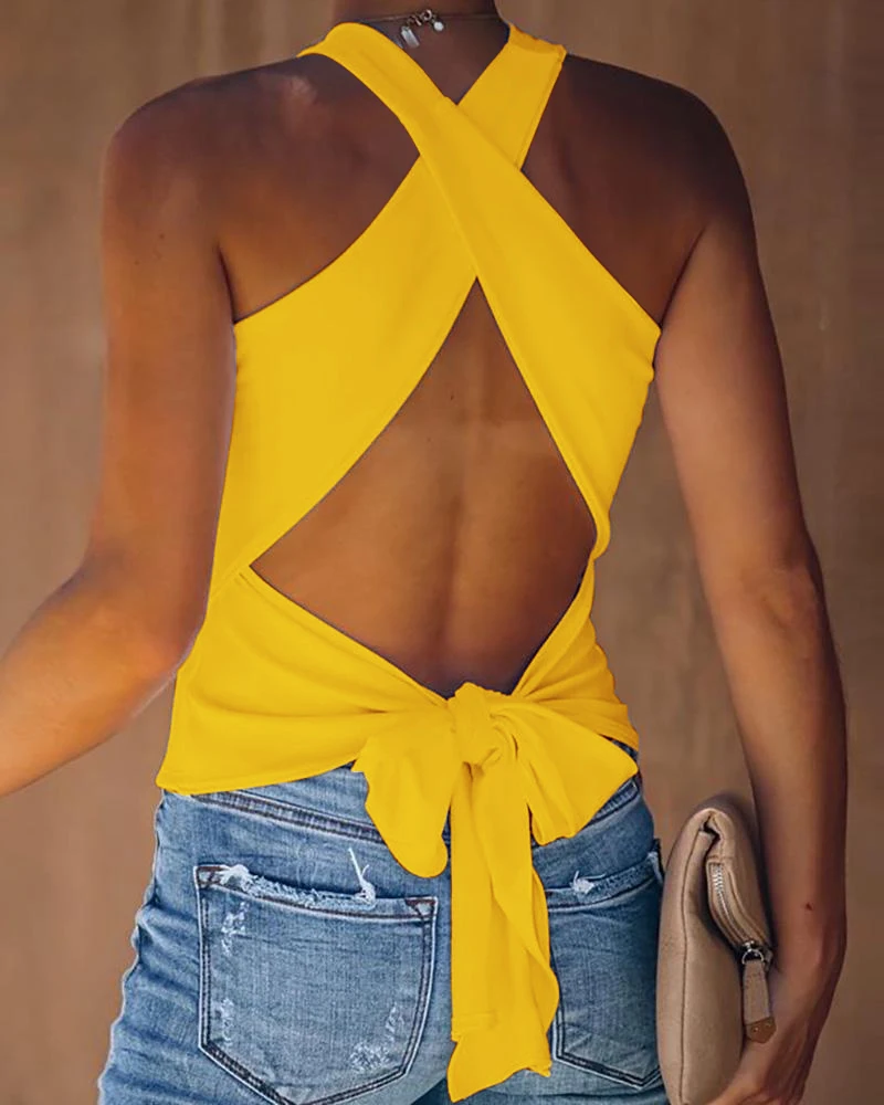 Женский летний топ с открытой спиной, повседневный жилет без рукавов, топы с открытой спиной и узлом, пикантный топ с открытой спиной и бантом