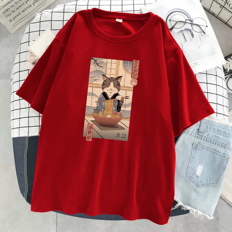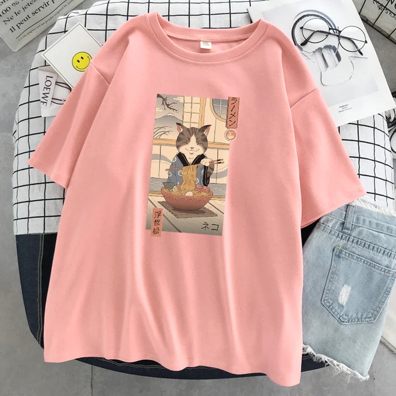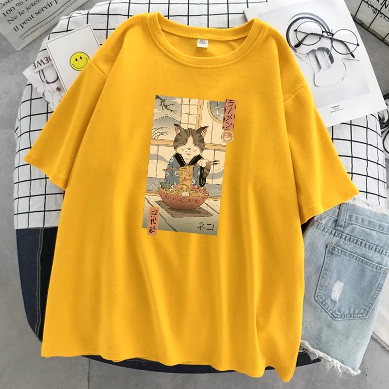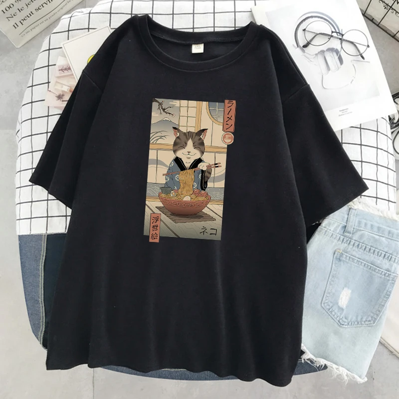 Забавная комиксная женская футболка Neko Raman Ukiyo-E, повседневны...