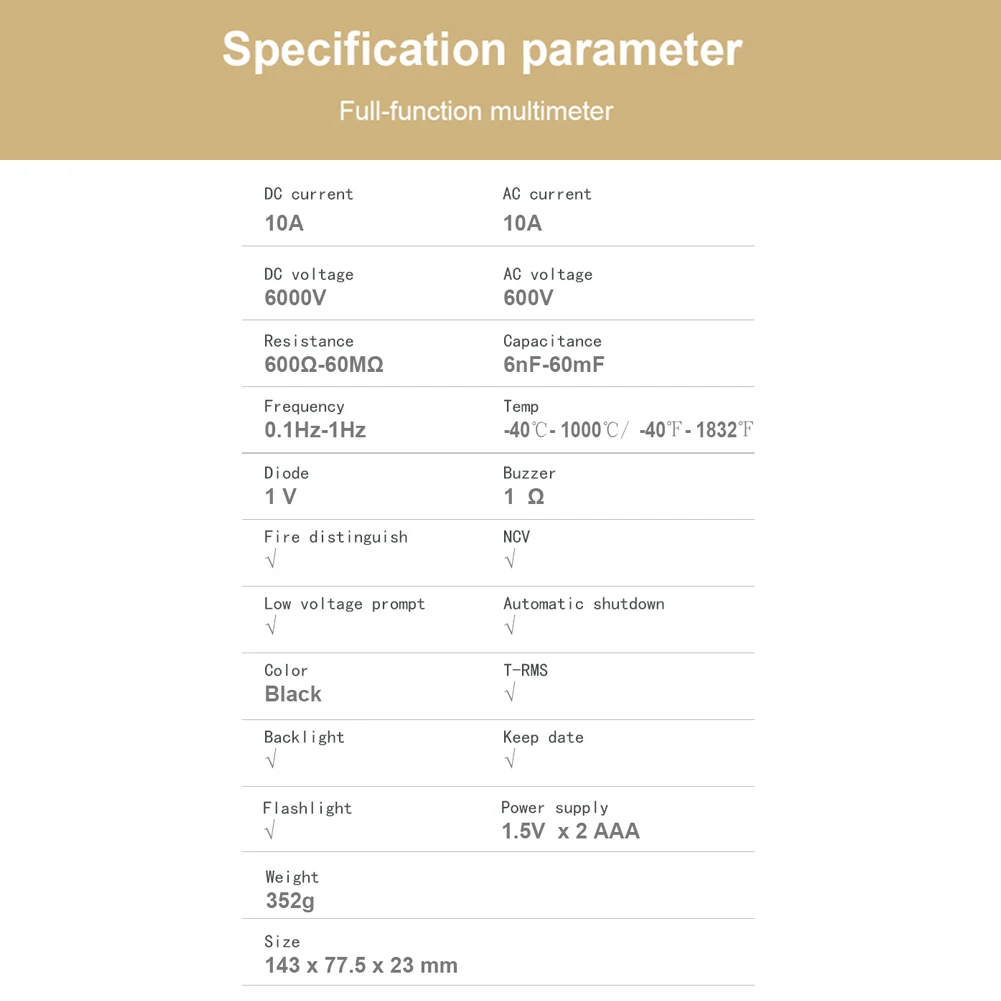 Этот мультиметр с большим ЖК-экраном, и он маленький по размеру, как фаблет, более практичный и новый. С многофункциональными, такими как напряжение переменного тока, напряжение постоянного тока и Измерение тока, сопротивление, емкость, измерение диодов и так далее. Приходите и попробуйте, это не подведет вас. Особенности:С 4,7 дюймов экран высокой четкости, который позволяет вам управлять и смотрите данные более четко, даст вам лучший опыт использования.Многофункциональный: он используется для измерения напряжения переменного и прямого тока и тока, измерения емкости и сопротивления, бесконтактного напряжения и измерения температуры NCV, измерения диодов и непрерывности, распознавания проводов firewire и null.С функцией двойного звукового сигнала и светильник, который поможет вам лучше напомнить.С мягкой и прочной защитной крышкой и функцией сейсмического pro-tection, которая может защитить мультиметр и продлить время обслуживания.С функцией фонарика и подсветки вы можете использовать его в условиях тусклой освещенности или в темноте. Характеристики:Материал: АБС-пластикЦвет: красныйМощность: 2 аккумулятора * AAA (не входит в комплект)Постоянный ток: 10AТок переменного тока: 10AНапряжение прямого тока: 6000 ВНапряжение переменного тока: 600 ВСопротивление: 600Ω ~ 60MΩЕмкость: 6nF ~ 60mFЧастота: 0,1 Гц ~ 1 ГцТемпература: -40 ℃ ~ 1000 ℃/-40 ℉ ~ 1832 ℉Диод: 1 вЗуммер: 1ΩРазличие между огнем: ДаNCV: ДаПодсказка низкого напряжения: ДаАвтоматическое выключение: ДаT-RMS: ДаПодсветка: ДаСохранить дату: ДаФонарик: ДаРазмер изделия: 143*77,5*23 мм/5,6*3,1 * 0.9inРазмер посылка: 153*87,5*30 мм/6,0*3,4 * 1.2inПосылка Вес: 339 г/12,0 унции Упаковочный лист:1 * мультиметр1 * Руководство пользователя1 * Температурный кабель1 * TestHead