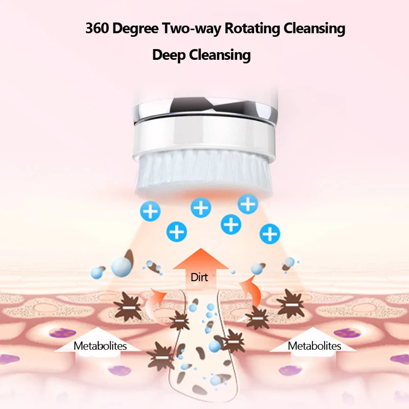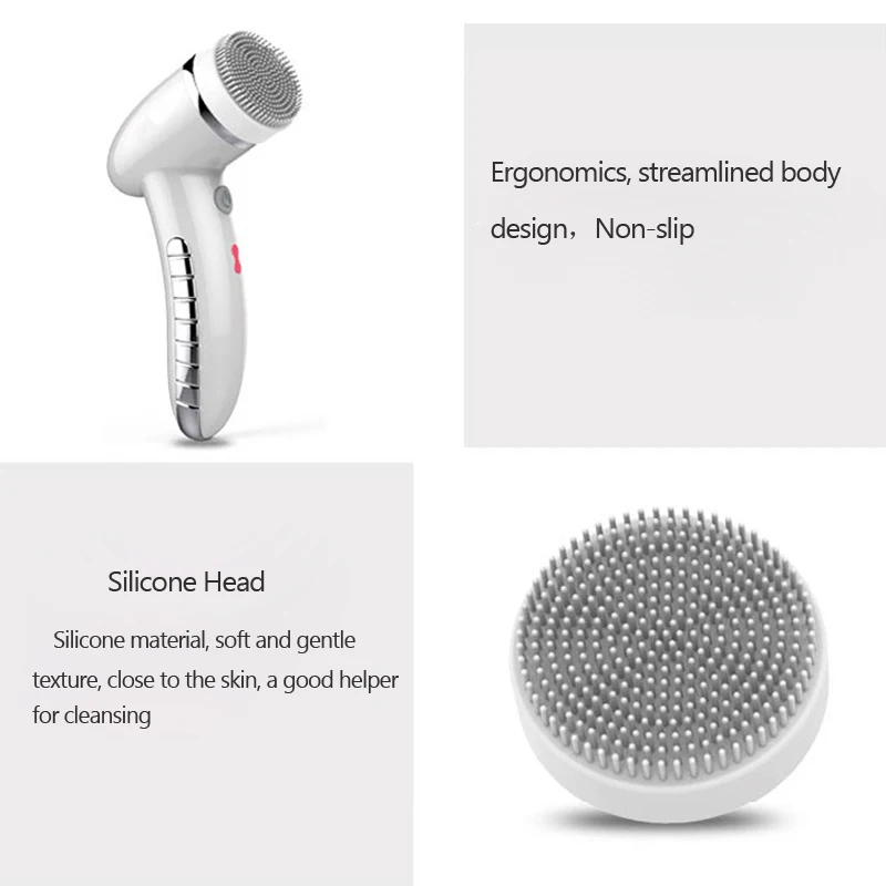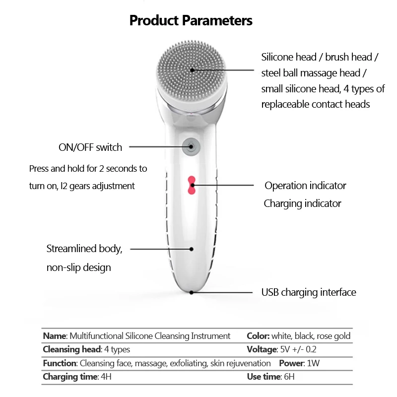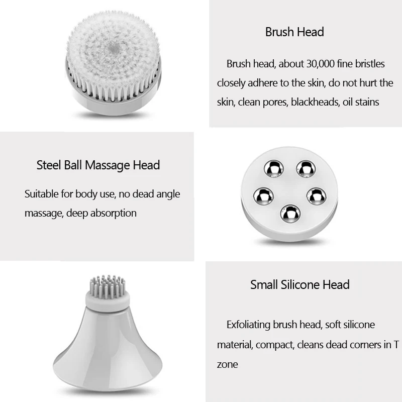 2) 4 teste della spazzola на soddisfare le different esigenze: 4 diversi teste di ricambio, un lungo spazzola morbida на la quotidiana pulizia profonda, un pennello из силикона на E un piccolo viso per le piccole parti di UN pennello из силикона e una sfera di acciaio testa di massaggio. Massaggio на soddisfare tutte le vostre cura della pelle ha bisogno di.