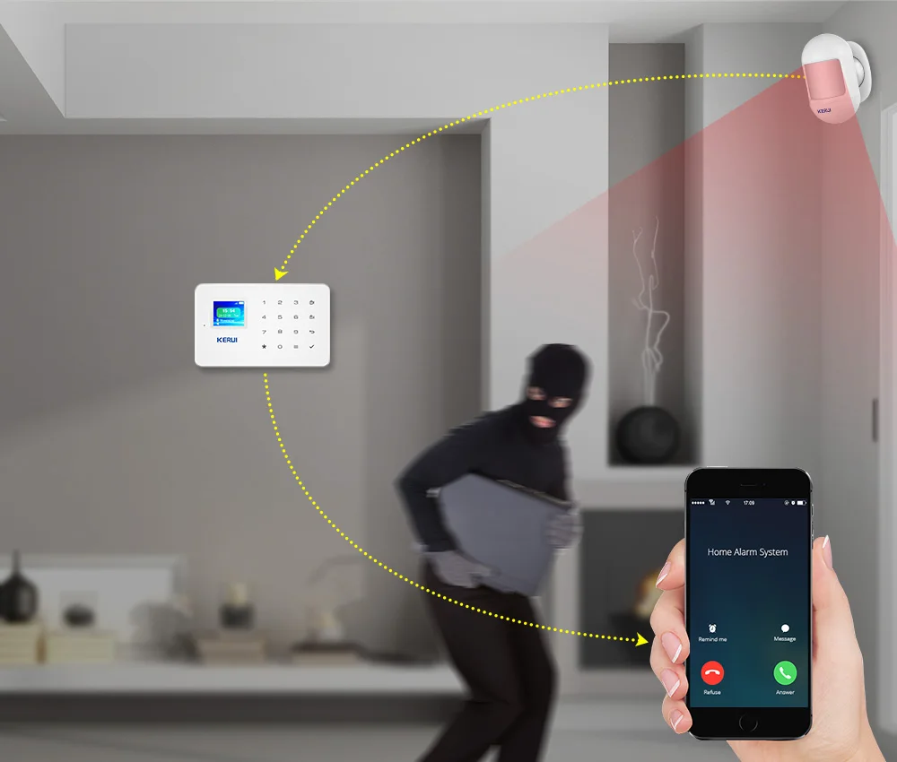 Когда детектор движения срабатывает, он будет звучать и передавать сигнал на системную панель. Хост системы сигнализации будет звучать и отправлять SMS/звонки на ваш предустановленный номер телефона. Вы получите уведомление в первый раз