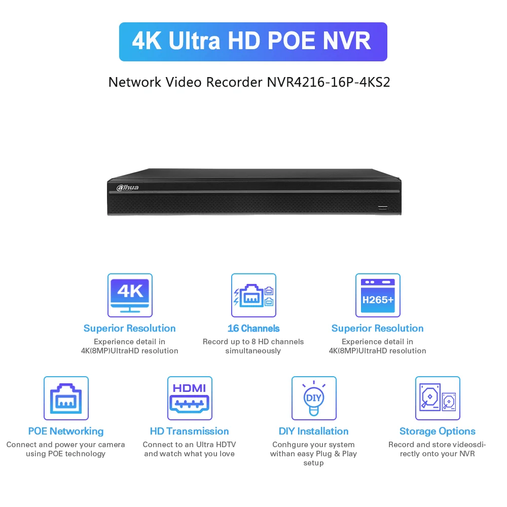 Dahua NVR 8MP 4K NVR4208-8P-4KS2 NVR4216-16P-4KS2 8CH 16CH POE H265 + HDMI видео рекордер для IP камеры безопасности CCTV системы