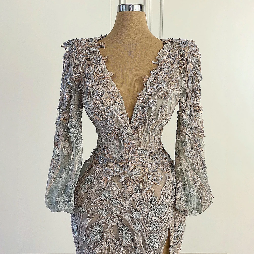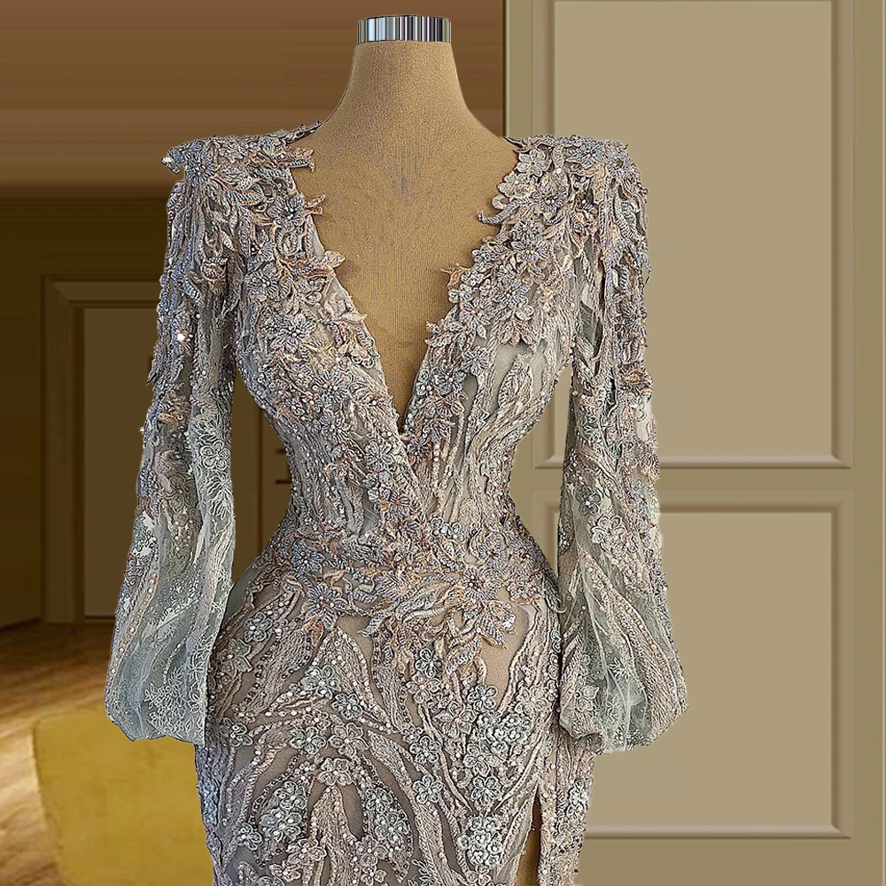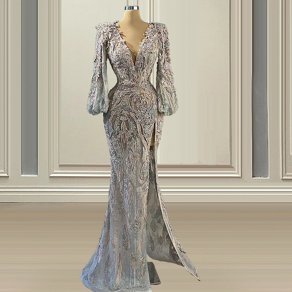 Платье с V-образным вырезом, рукавами-фонариками, 2021, серое, с высоким разрезом, для гостей на свадьбу, Русалочка платья для торжеств