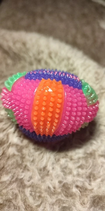 мячик для маленьких собак, не склонных грызть игрушки. Хватает на неделю. Очень хорошо виден не только ночью, но и днем - очень яркие цвета всех элементов. Мячик состоит из внешней оболочки, на которую наклеены резиновые полоски и внутреннего контейнера со светодиодом. Внутренний контейнер звенит, как колокольчик, чем очень привлекает внимание собаки и собака рвется посмотреть, что же там внутри. Резиновые полоски через неделю начинают отрываться. Пищалка сдохла в первый же день. Контейнер со светодиодом пока держится, но вот-вот помрет - уже не так хорошо реагирует на удары и светится не так ярко. Честно говоря, срок службы изделия очень мал. Такие игрушки должны быть из гораздо более толстой резины.
