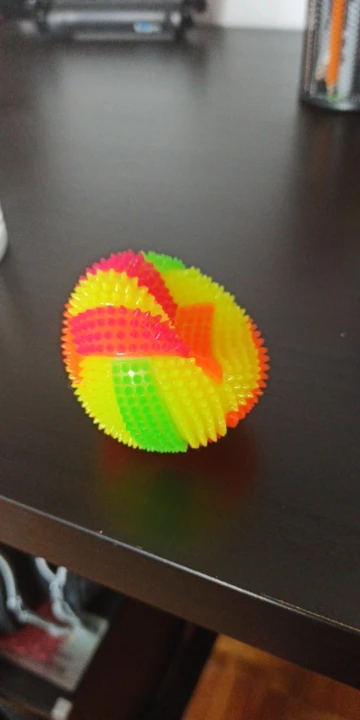 Доставка быстрая. Мяч мягкий, яркий, при бросании светится, пищалка громкая. Но мяч отвратительно пахнет. Очень сильный запах бензина