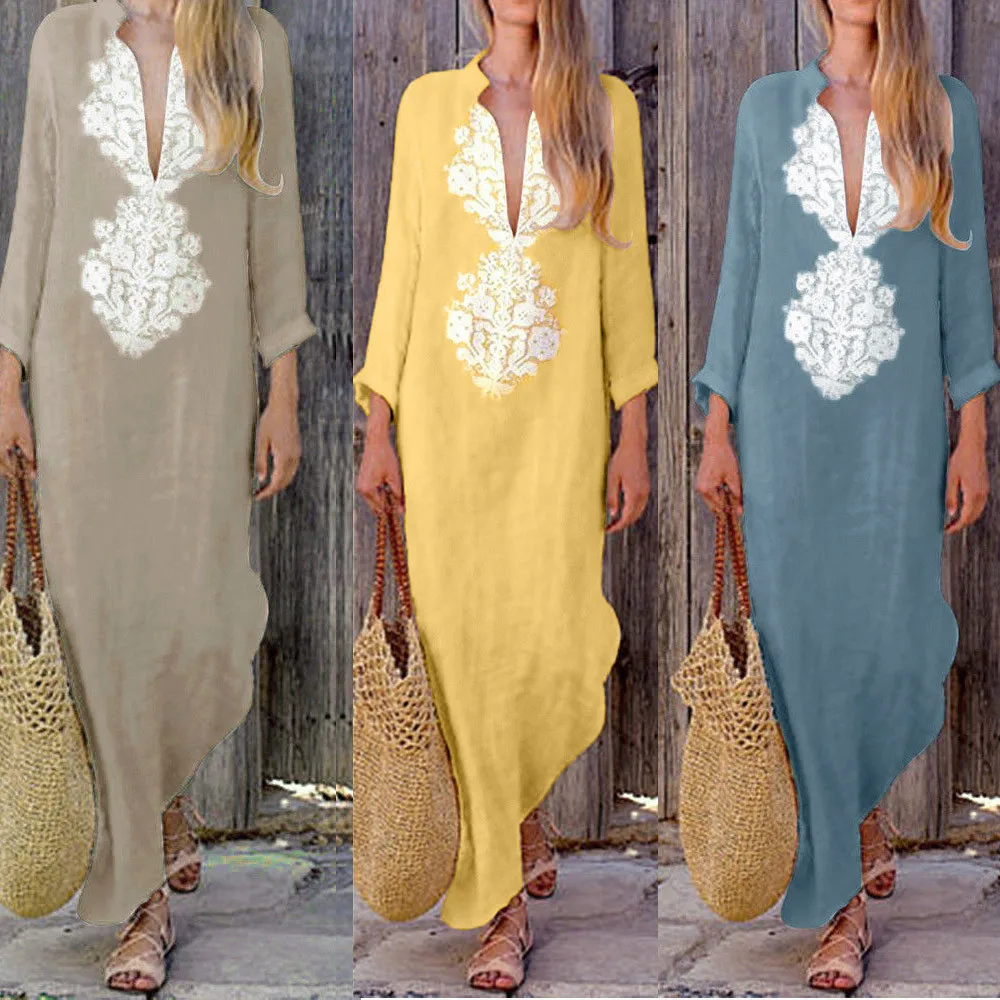 Женское длинное платье с принтом, летнее платье макси с V-образным вырезом и разрезом на подоле, мешковатый кафтан, сарафан, размера плюс
