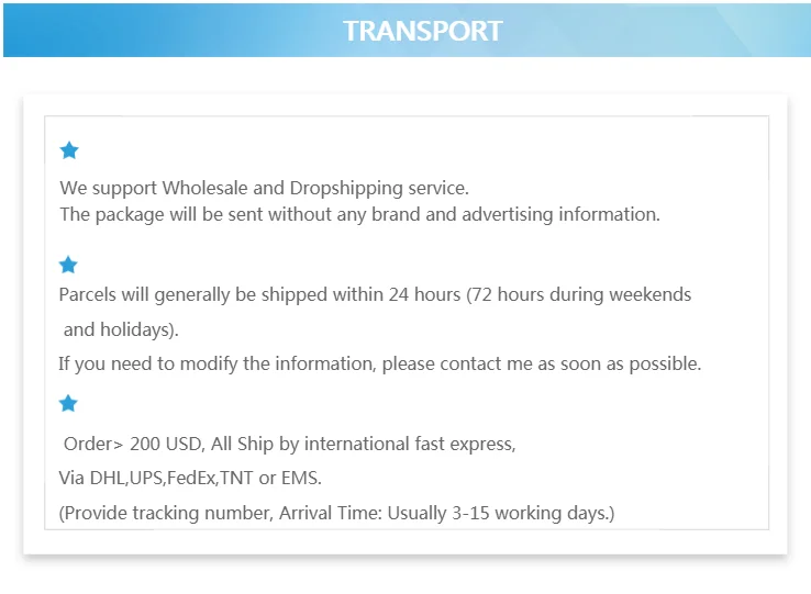 1). Пожалуйста, подтвердите точность информации о получении при покупке. (Имя, адрес, почтовый индекс, телефон) 2). Фотографии сделаны нами. Цвет может немного отличаться из-за цветовой калибровки каждого отдельного монитора. 3). На ваш запрос, связанный с нашим продуктом и ценой, ответят в течение 24 часов. 4). Пожалуйста, укажите ваши особые пожелания (цвет посылка) при оплате. 5). Мы поддерживаем оптовые и прямые поставки. Посылка будет отправлена без какой-либо торговой марки и рекламной информации. 6). Мы поддерживаем настройку продукта и посылка для больших партий. Если вам нужен индивидуальный заказ, вы можете связаться с нами. 7). Заказ> 200 долларов США, все отправляются международной экспресс-доставкой через DHL,UPS,FedEx,TNT или EMS. (Предоставляется номер для отслеживания, Время прибытия: обычно 3-12 рабочих дней.) 8). Все товары продаются в хорошем качестве и проходят строгую проверку перед отправкой. Мы приложим все усилия, чтобы избежать любых проблем, связанных с качеством. 9). Если вы не удовлетворены нашим товаром, пожалуйста, не оставляйте плохой отзыв. Свяжитесь с нами, мы решим эту проблему для вас. Спасибо за поддержку!