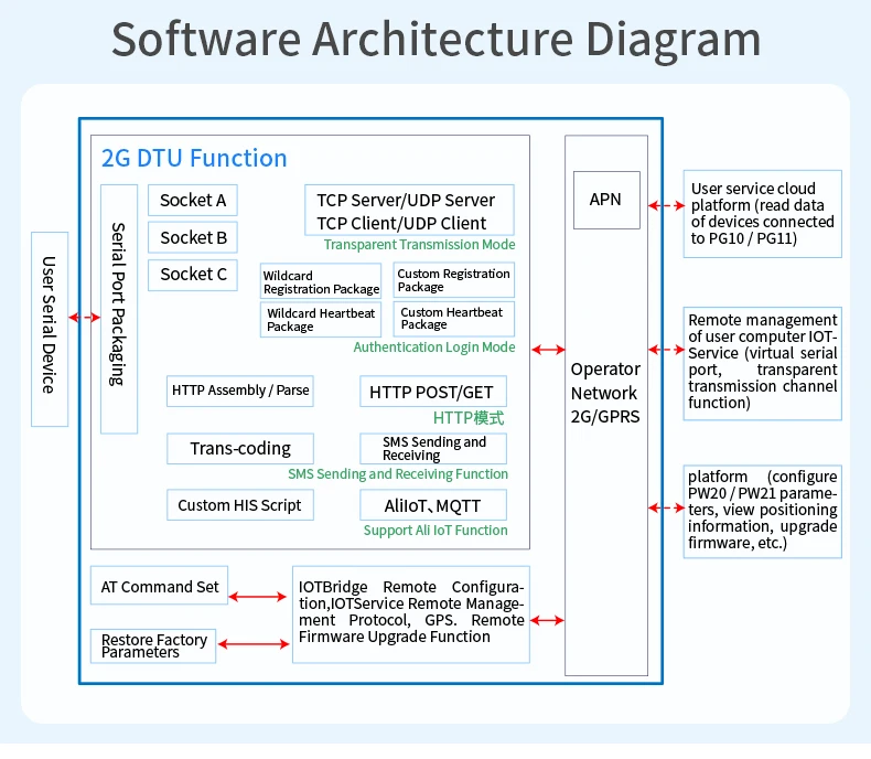 Поддержка нескольких режимов работы: прозрачный сетевой режим передачи, режим HTTP, MQTT, WebSocket