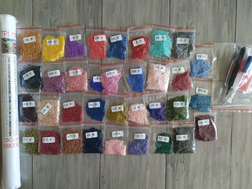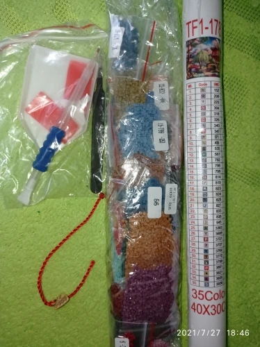Доставка около 3 недель до пункта выдачи. Пропечатка хорошая, реальный размер выкладки 39х29. Стразы яркие, упакованы в зип-пакеты, все 35 цветов в наличии. Инструменты хорошие - лоток, стилус с насадками, хороший пинцет, масса для стилуса.