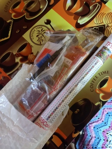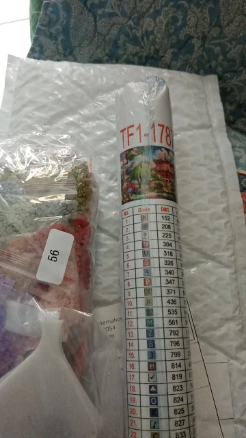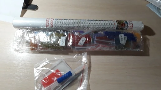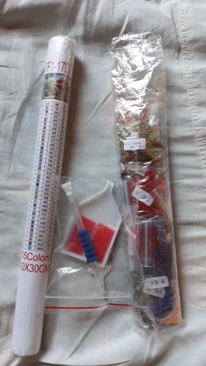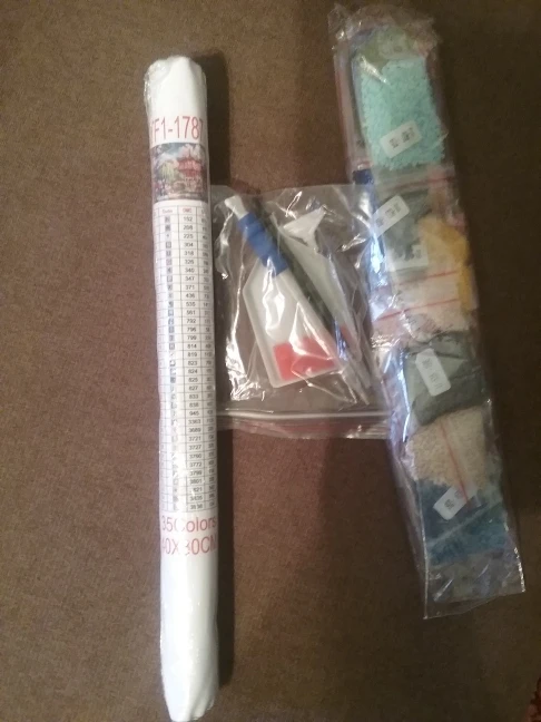 Доставка месяц. Состояние отличное. Выиграла за монеты. В комплекте полотнона валике в пакете, клей и инструменты для сборки с разными насадками, в отдельном пакете, 35 зиппакетов (о это превосходно и очень удобно, у других продавцов сама фасовала по пакетам) с камешками. Дополню отзыв после сборки