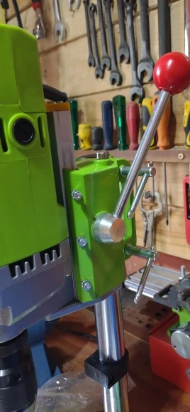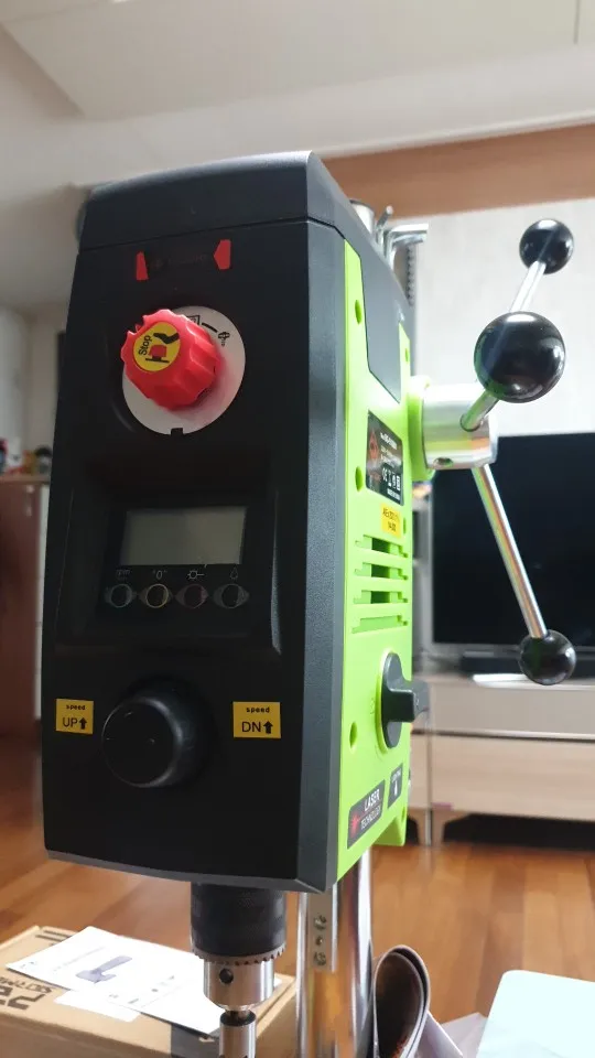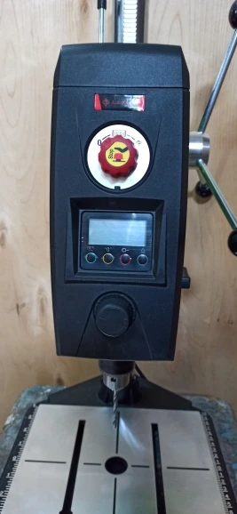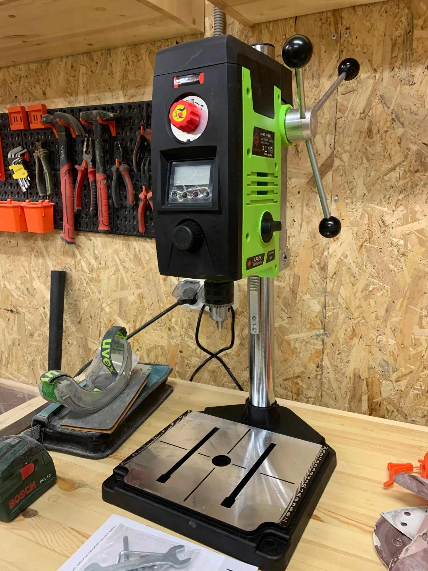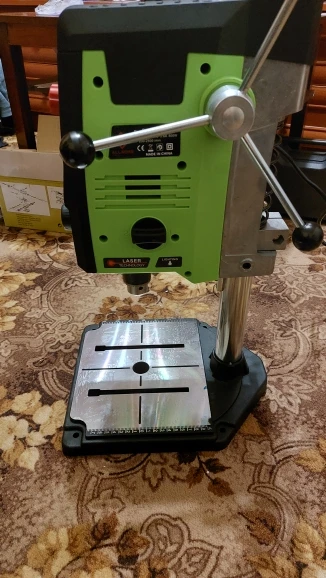 Плюсы+ Люфты: на моем экземпляре вообще нет и патрон зажимает ровно. Вверх вниз рельса не шелохнется, сверлит очень хорошо, пробовал сверлить сталь 8мм сверлом 12мм на 500 оборотах примерно, сверлит уверенно, обороты держит хорошо и электроника наваливает момент на валу когда надо. Мотор реально 800Вт или очень близко к указанному, на минимальных оборотах остановить крайне сложно (я не смог). Сама сверлилка компактная и удобная эргономика, стойка 2мм. Транспортная упаковка отличная, коробка в коробке как подобает нормальному бренду. Минусы- Редукторник достаточно шумный (основное разочарование), площадка алюминь и разметка прям несуразная какая то. Спорный момент: нет реверса, да и нужен он вообще? Доставка заняла 11 дней.