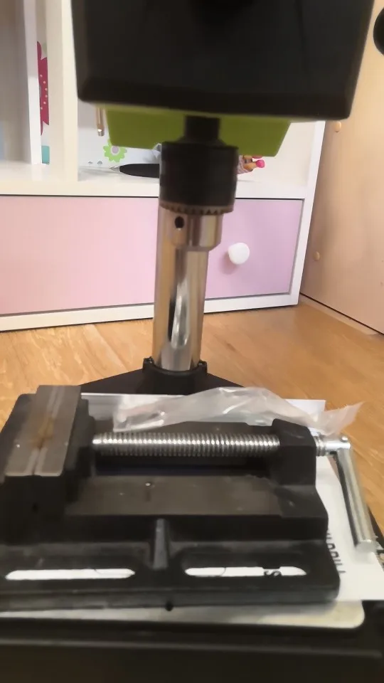 Немного люфтит сама дрель от основания, вроде бы есть регулировка этого зазора, но видно что внутри салазки пластик.. прижимая сильнее дрель уходит от вертикальной оси..