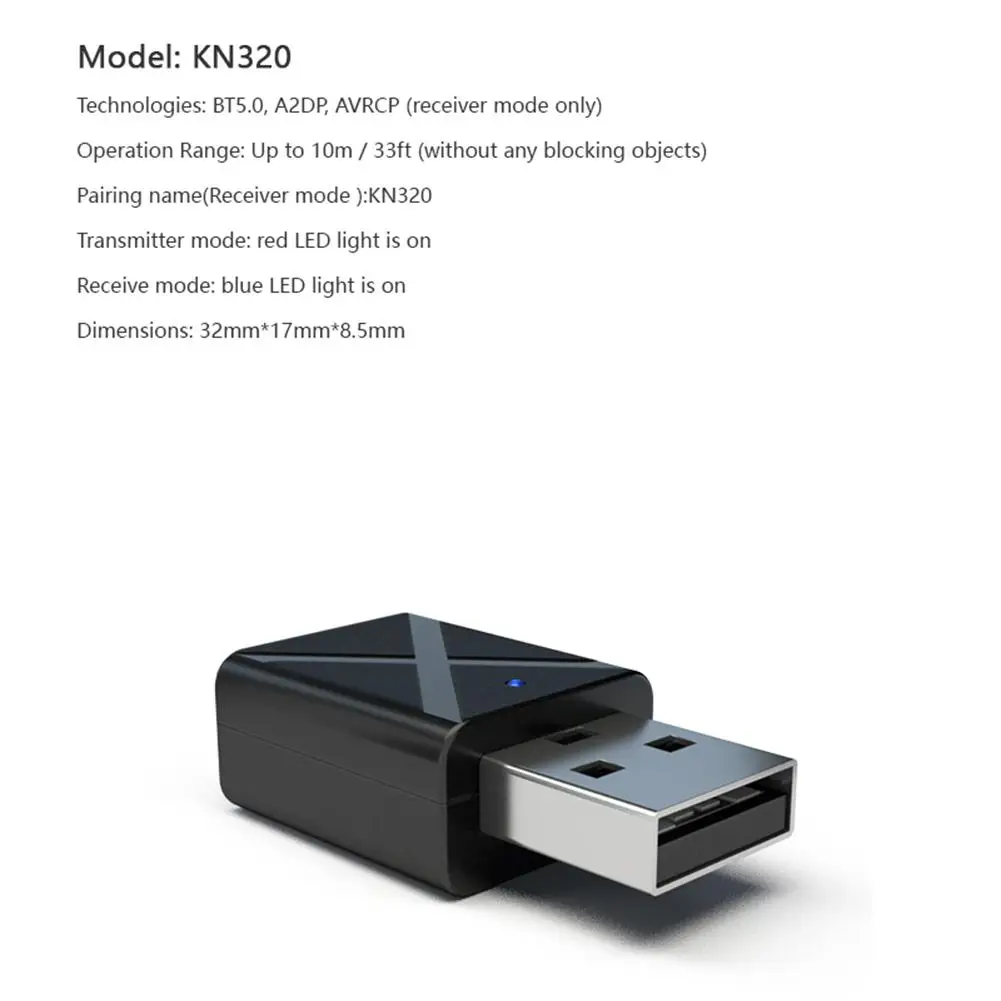 Характеристики:Модель: KN320Технологии: BT5.0, A2DP, AVRCP (только режим приемника)Рабочий диапазон: до 10 м/33 футов (без каких-либо блокирующих объектов)Имя сопряжения (режим приемника):KN320Режим передатчика: Красный светодиодный светильник включенРежим приемника: синий светодиодный светильник включенРазмеры: 32 мм * 17 мм * 8,5 мм