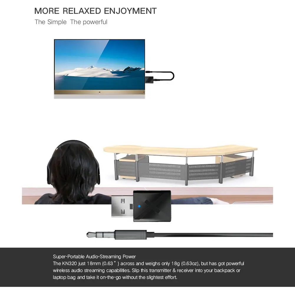 6. Супер-Портативное аудио-потоковое питаниеKN320 всего 18 мм (0,63 дюйма) и весит всего 18 г (0,63 унций), но имеет мощные возможности беспроводной передачи аудио. Вставьте этот передатчик и приемник в рюкзак или сумку для ноутбука и возьмите его на ходу без каких-либо усилий.