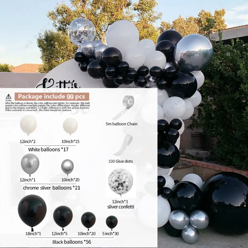 Черный латексный шар * 56(5 дюймов * 30,10 дюймов * 20,12 дюймов * 5,18 дюймов * 1)Белый латексный шар * 17(10 дюймов * 15,12 дюймов * 2)Хромированный серебристый воздушный шар * 21(10 дюймов * 20,12 дюймов * 1)12 дюймов серебряные конфетти * 31 шт. 5 м цепочка для воздушных шаров1 шт. воздушный шар Клей