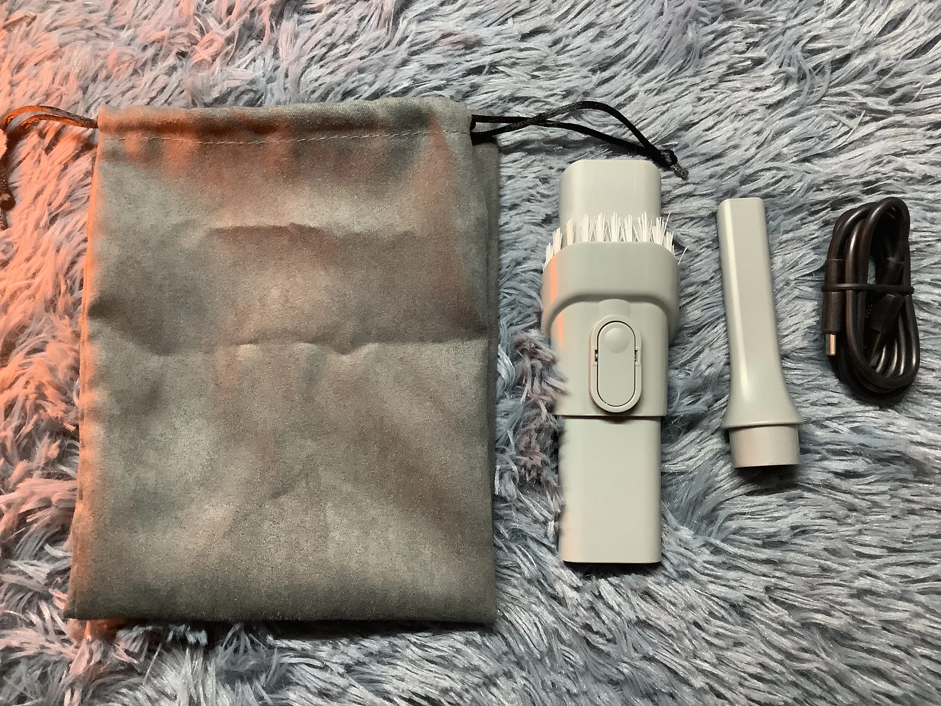 produto enviado corretamente chegou rápido e não foi taxado qualidade excepcional desde a embalagem até os acessórios produto vem com um cabo USB tipo C, um bico com escova para puxar a sujeira e um bico fino para empurrar a sujeira apenas um botão que tem as funções ligar e desligar, ascender a luz e velocidades 1 e 2 recomendo muito a compra