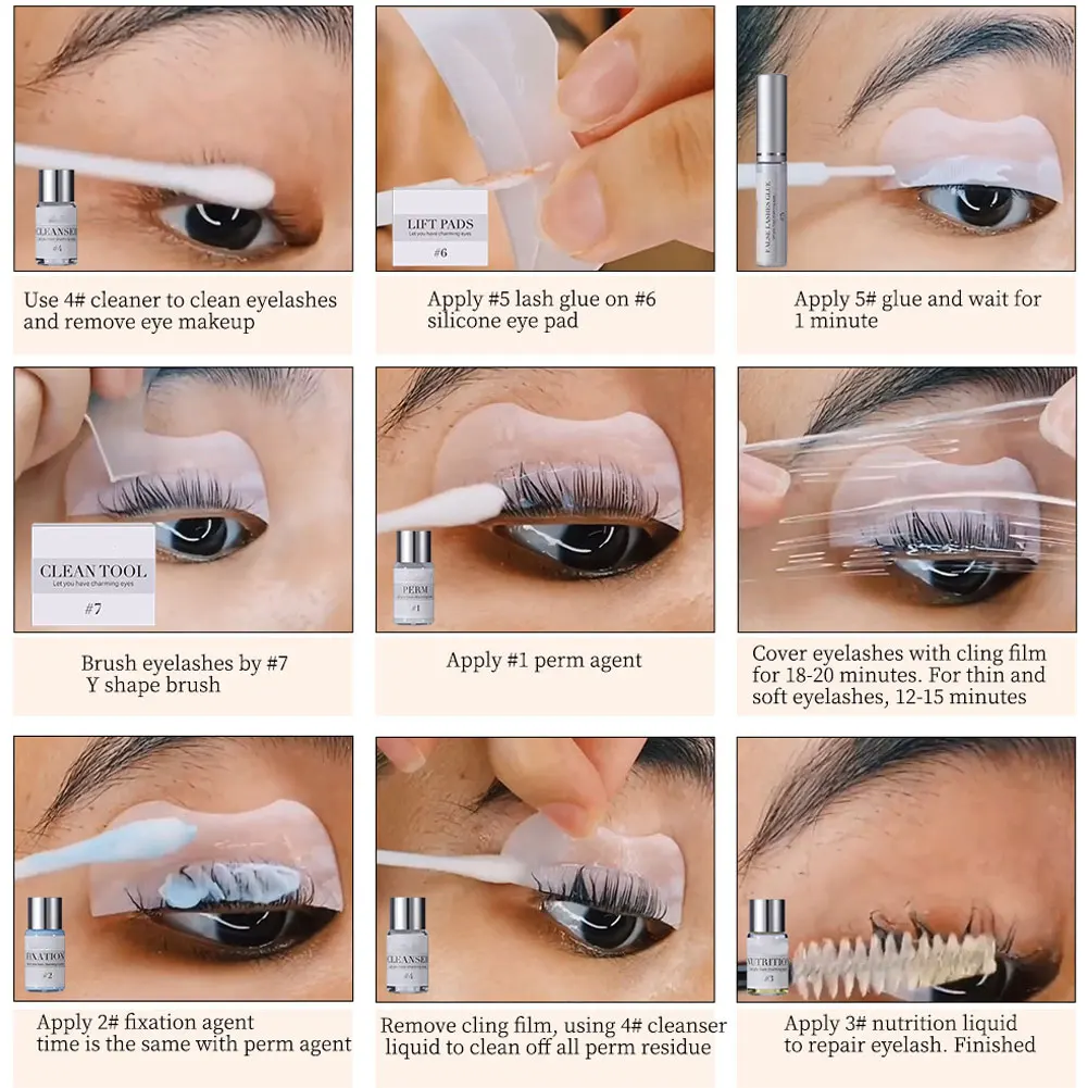 1. Очистите масло, пыль и остатки макияжа на ресницах. 2. Нанесите накладки на глаза под веки, чтобы защитить нашу кожу от лосьон для перманентной завивки волос. 3. Наденьте накладки на ресницы, а затем нанесите клей на ресницы, чтобы удерживать ее на подушечках. 4. Используйте клей, устанавливающий ресницы на подъемных подушечках около 1 минуты. 5. Используйте лосьон #1 perm на ресницах, а затем накройте пластиковую пленку около 8 ~ 12 минут. 6. Используйте фиксирующее средство #2 на ресницах, а затем накройте пластиковую пленку около 8 ~ 12 минут. 7 、 очистки ресниц периметра взлетно-посадочной колодки, затем используйте #3 Питание лосьон для питания ресниц. 8. Используйте очистку № 4 для очистки всех остатков Перми.