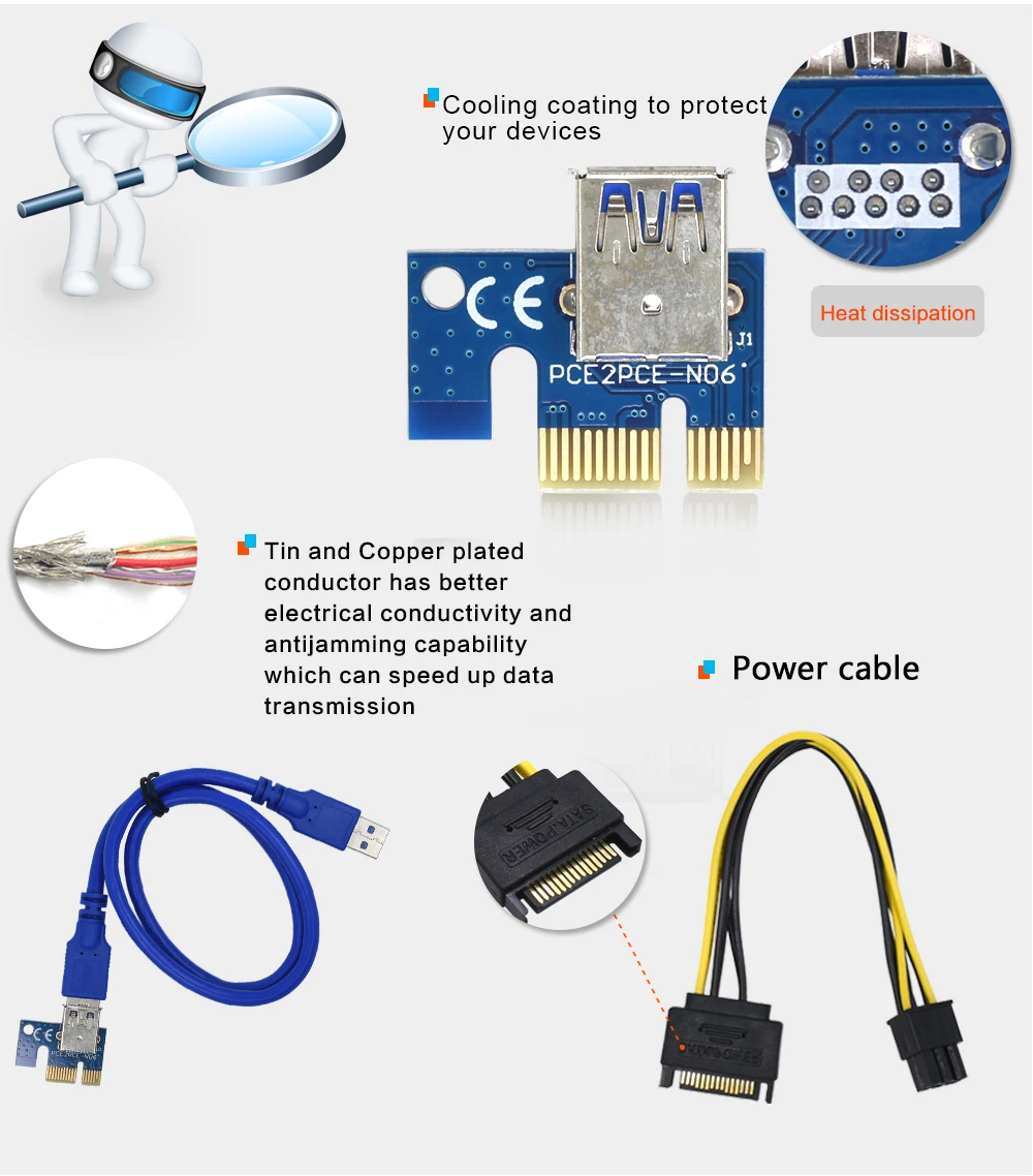 5 шт. TISHRIC PCIE Райзер-карта Pci VER008C SATA 15 Pin To 6Pin Экспресс 1X to 16X адаптер к USB 3,0 кабель Майнер биткоинов