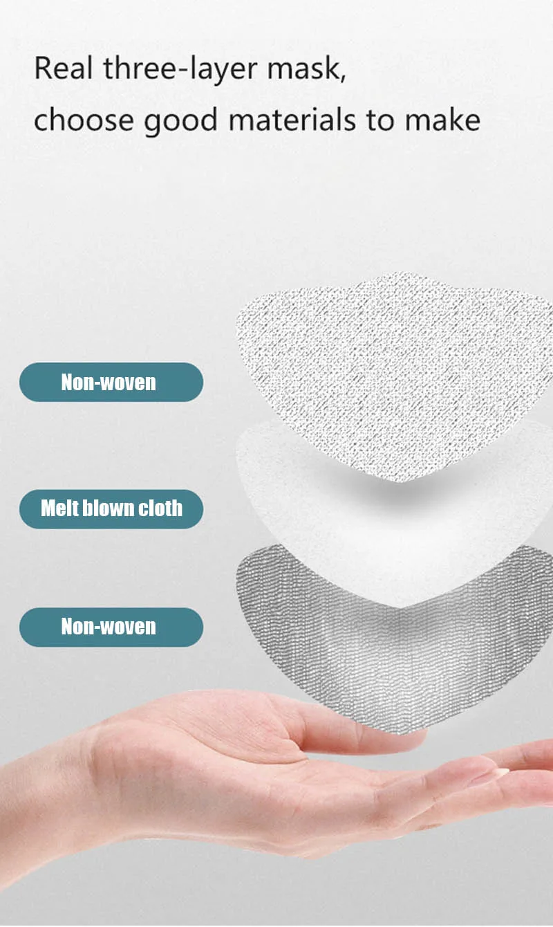 Нетканые одноразовые маски изготовлены из 3 слоев материалов (первый слой-Нетканая ткань, второй слой-выдувная ткань из расплава, а третий слой-Нетканая ткань). Он безопасен и безопасен в использовании, дышащий и милый, и его рисунок делает его практичным и стильным. В 3-слойная Нетканая ткань дизайн может предотвратить попадание пыли, эластичный ухо плечевой ремень позволяет легко снимать и надевать цепочку и не давят на уши.