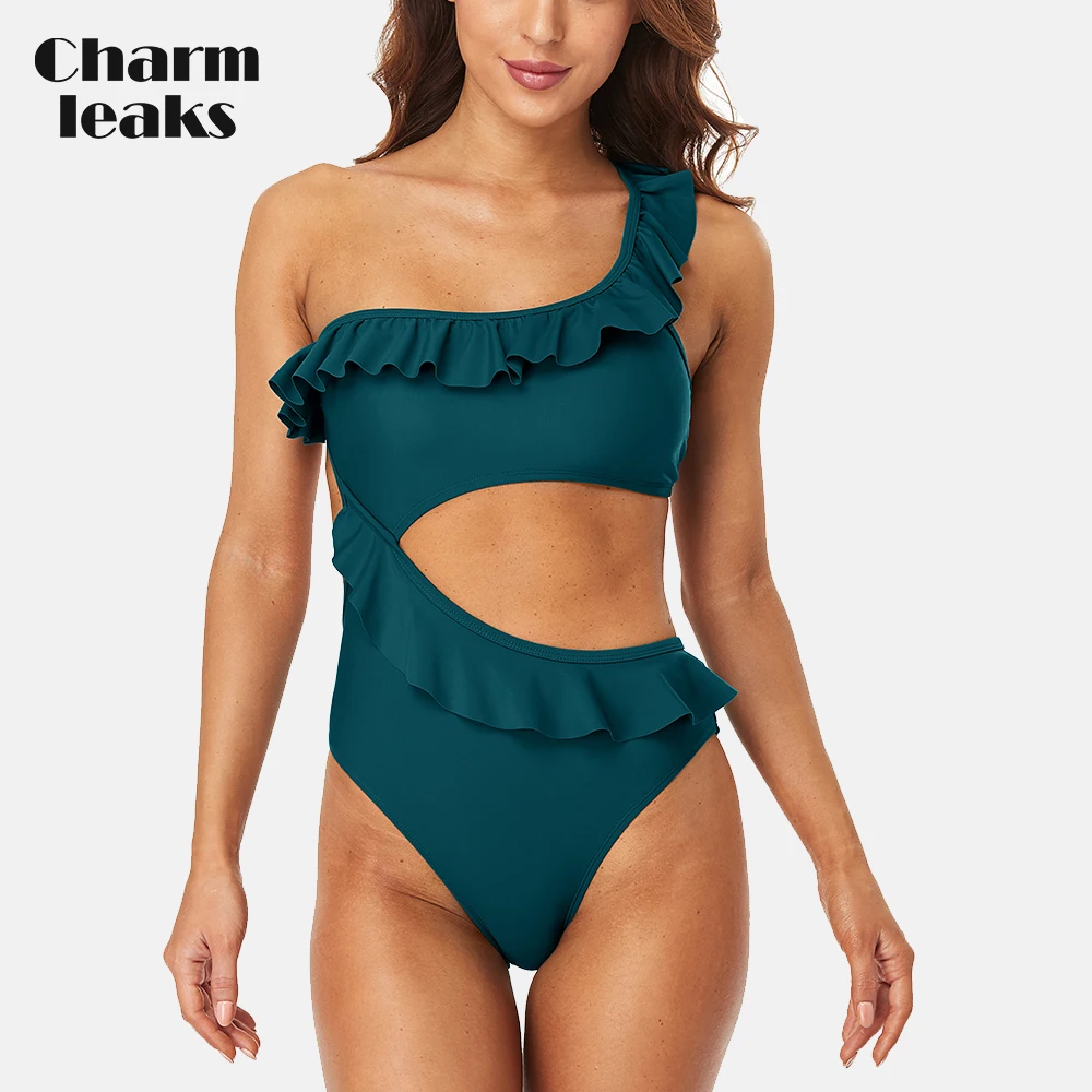 Сплошной купальник с оборками и вырезом charmleak, Женские однотонные купальные костюмы на одно плечо, монокини с открытой спиной, купальник