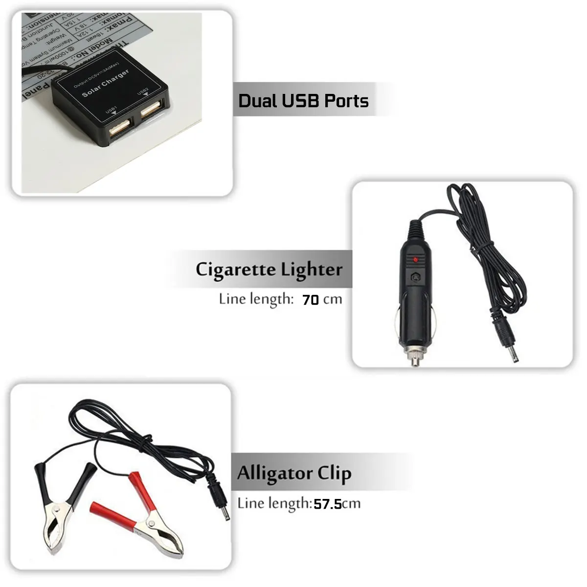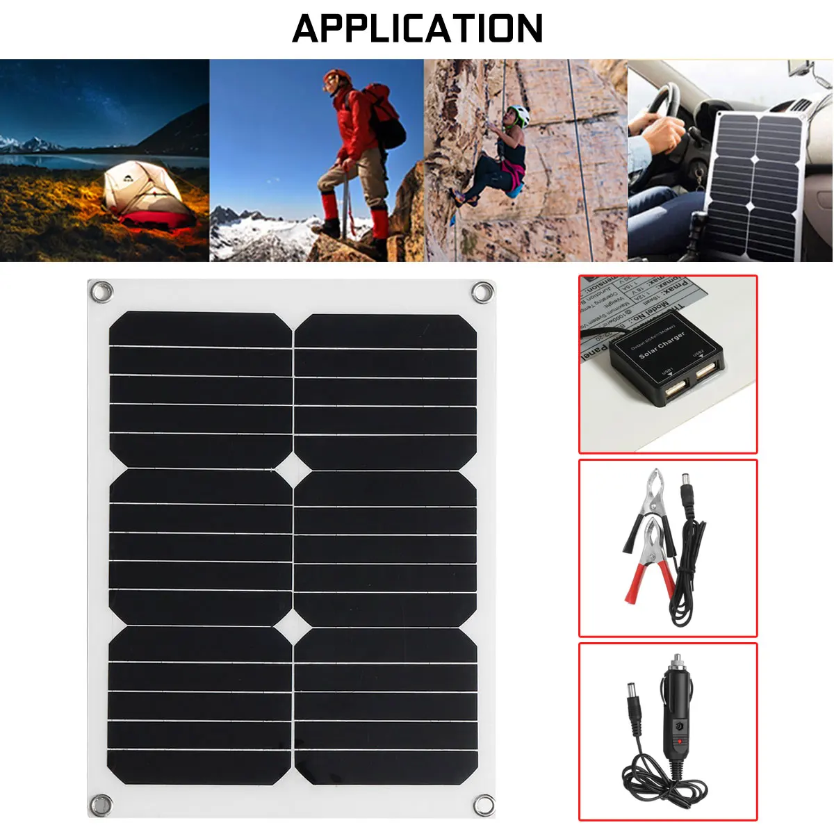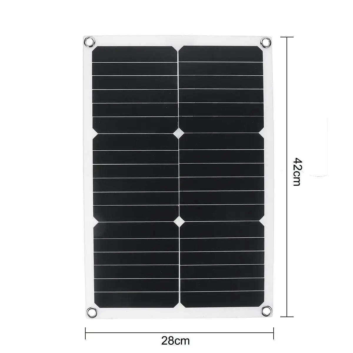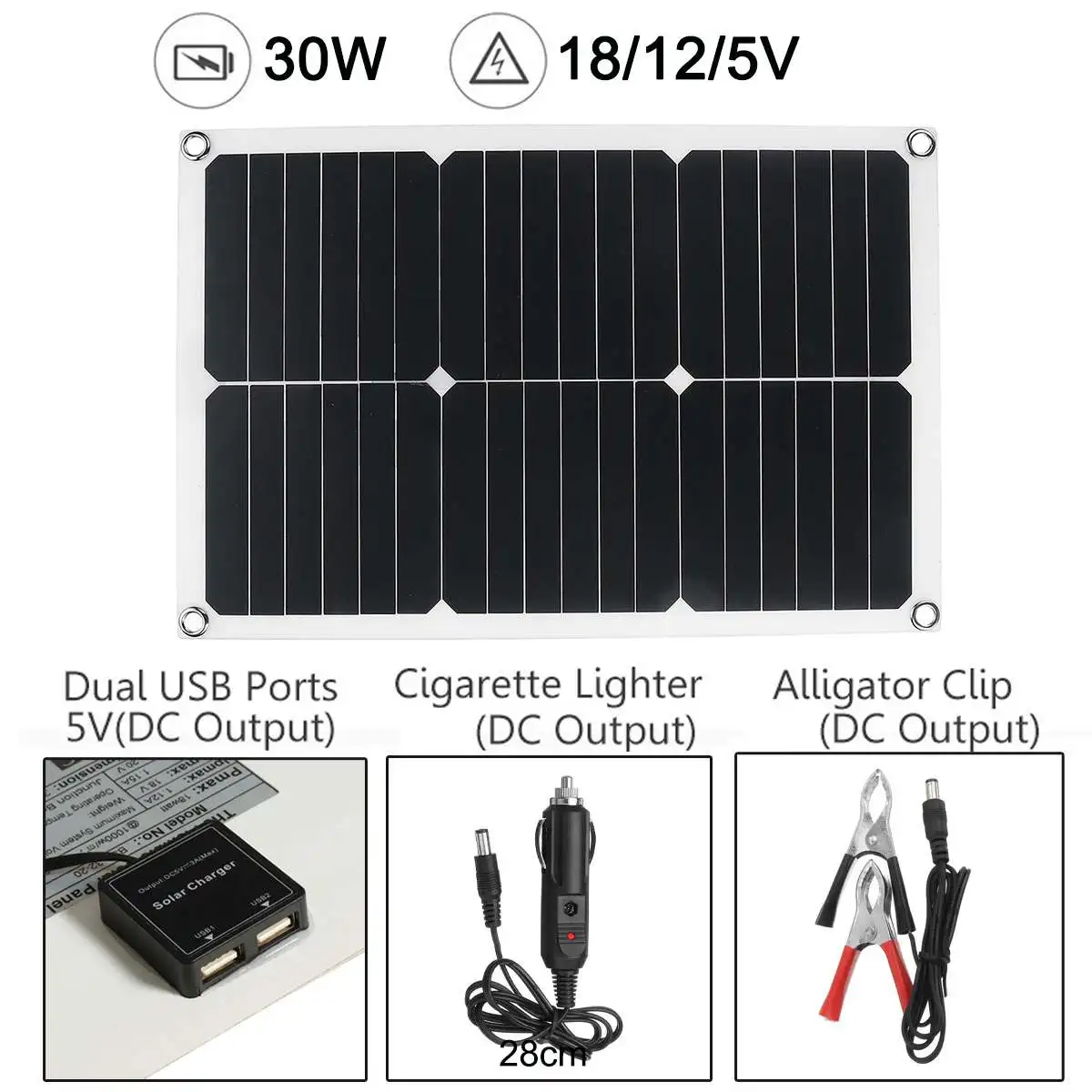 Посылка включает в себя:1 X Панель солнечных батарей1 х двойной USB выходАвтомобильное зарядное устройство-1 шт.1 X батарейный зажимСпецификация:Pmax : 30 ВтНапряжение: 5 ВРазмеры: 28cmX42cmIpmax : 6AVpmax :18 вМатериал: монокристаллический кремний (от sunpower)Особенности:1. Изготовлен из монокристаллического кремния, имеет высокий коэффициент конверсии 22 ~ 24%.2. Двойной выход с солнечной панелью с интерфейсом USB, удовлетворен вашими любыми требованиями.3. Экологически чистый и экологически чистый, он реализует Преобразование энергии от солнечной энергии к электрической энергии4. Широкий спектр применений, его можно использовать во многих местах, таких как для автомобилей, небольших бытовых приборов и т. Д.5. Солнечная панель-это устройство, которое прямо или косвенно преобразует солнечное излучение в электрическую энергию, поглощая солнечный свет. По сравнению с обычными батареями и перезаряжаемыми батареями, солнечные панели более энергосберегающие и экологически чистые.Примечание:В разных производственных партиях характеристики товара могут немного отличаться. Если вы хотите узнать разницу, пожалуйста, покупайте внимательно.Возможна погрешность в 1–3 см, связанная с особенностями измерения вручную.